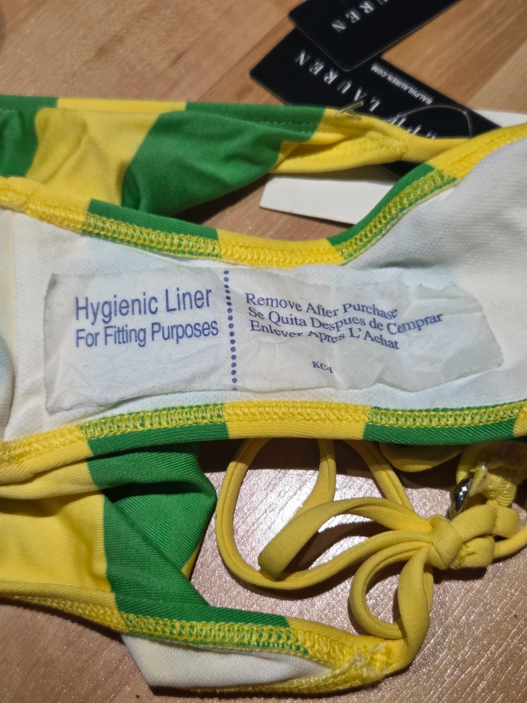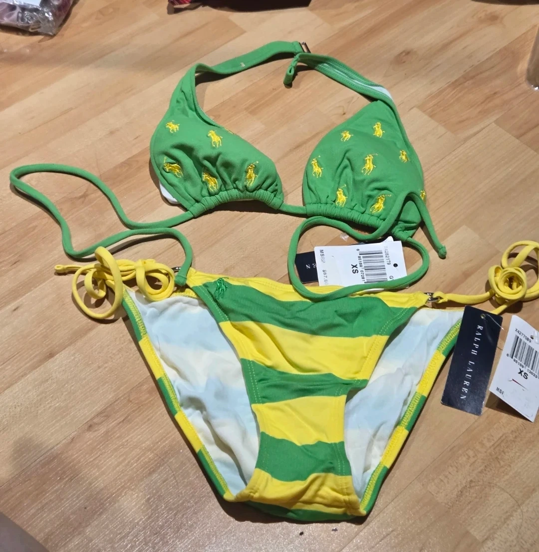 Ralph Lauren bikini set in green and yellow. Features a polo pony print on the top and stripes on the bottoms. Size is XS. Includes original hygienic liner. Brand new with tags.