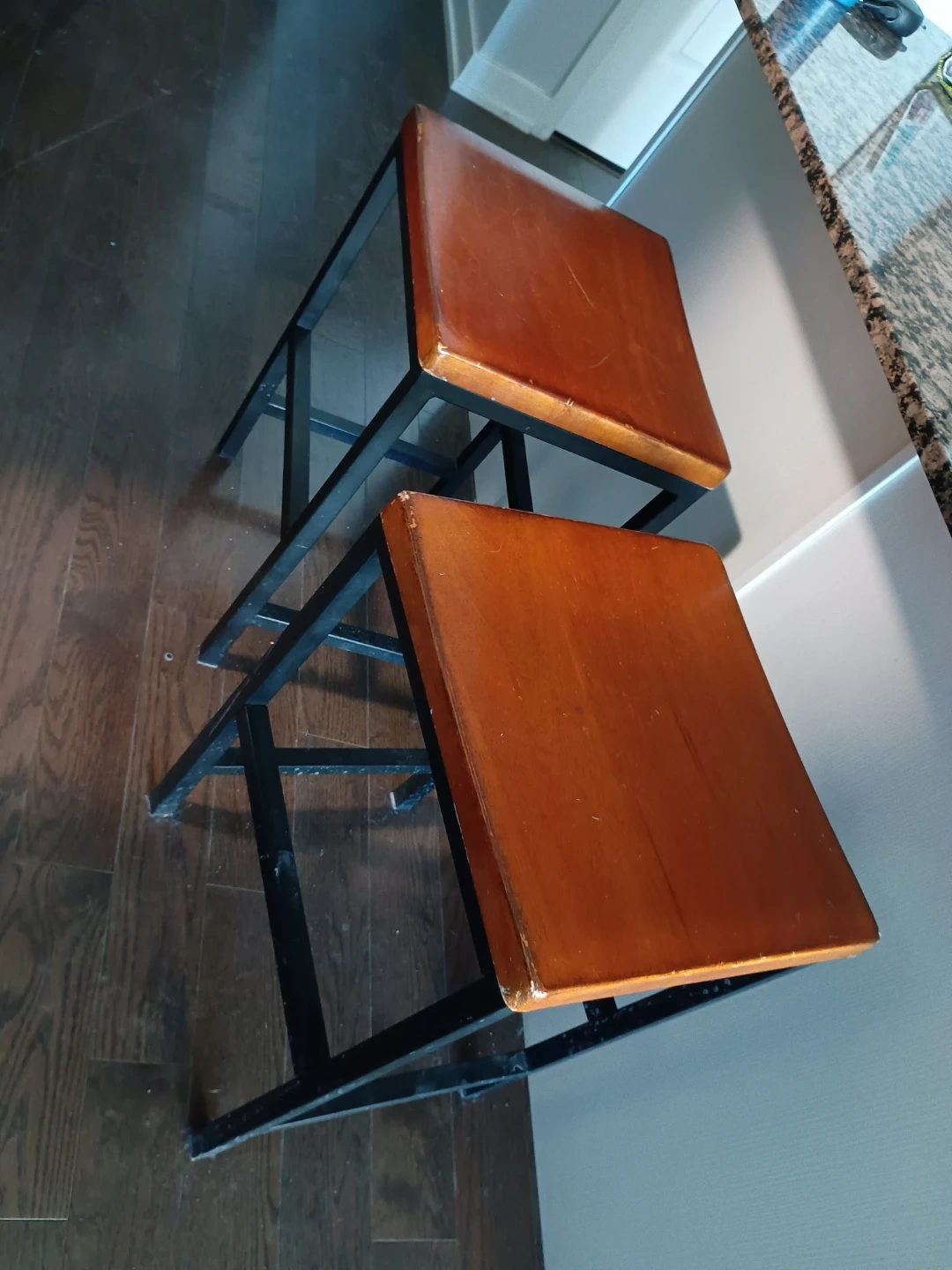 Selling a set of nesting stools with wooden tops and black metal frames. They're perfect for saving space and add a touch of modern style to any room. The stools show some signs of use, but are still sturdy and functional!