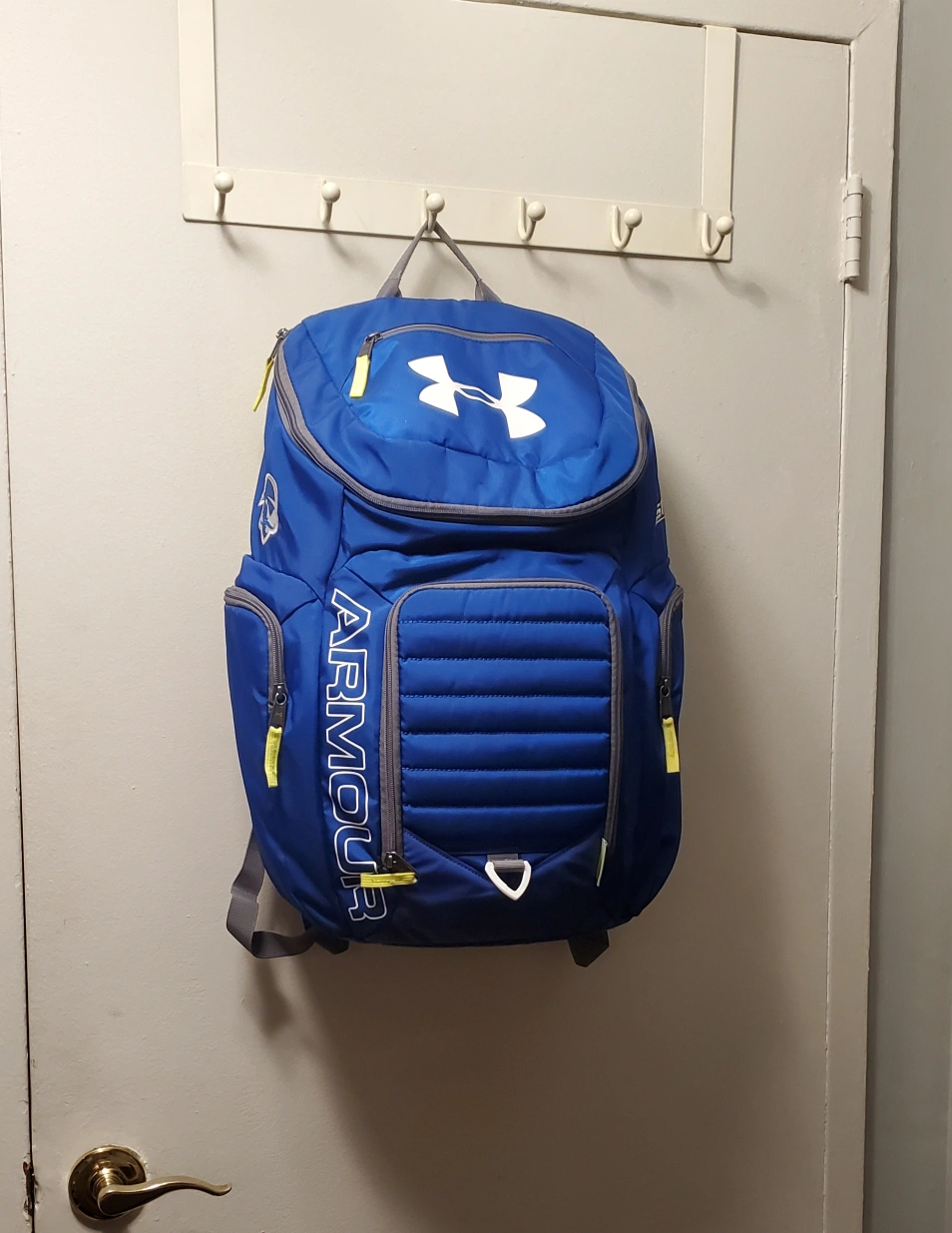 Four backpacks in various colours and sizes. Under Armour and Jansport brands.