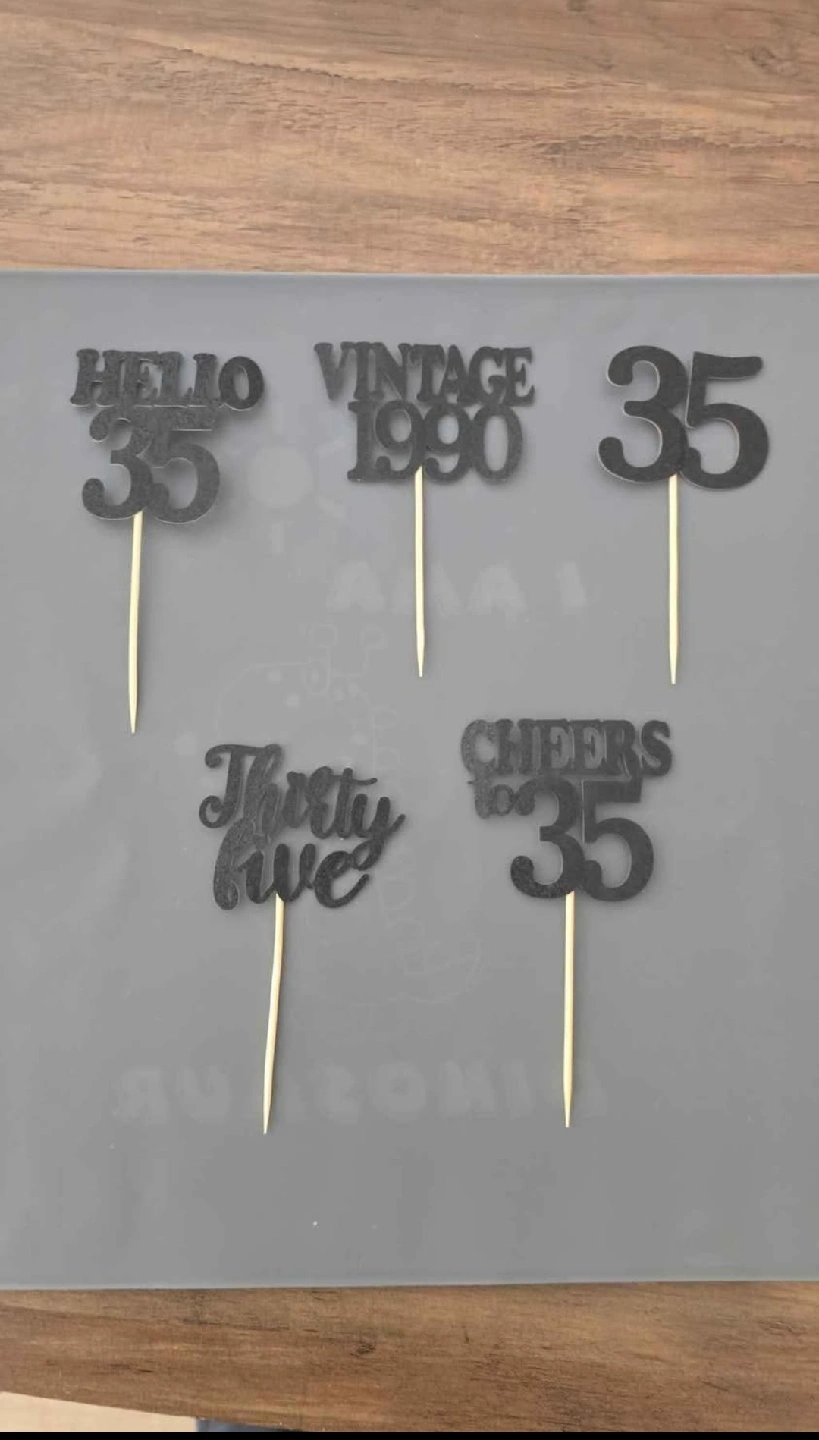 Selling a set of unused cupcake toppers for a 35th birthday celebration! Includes designs like 'Hello 35', 'Vintage 1990', and 'Cheers to 35'. Perfect for adding a special touch to your birthday cupcakes Total amounts- 28 in total "Hello 35"- 6 "Vintage 1990"- 6 "35"-6 "Thirty-five"- 6 "Cheers to 35"- 4