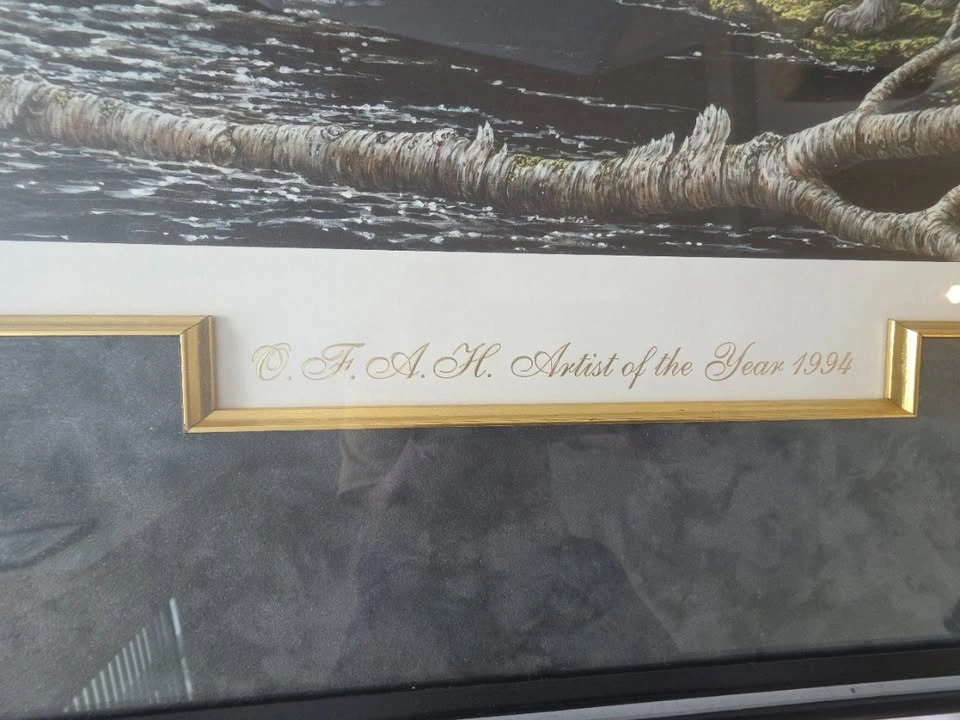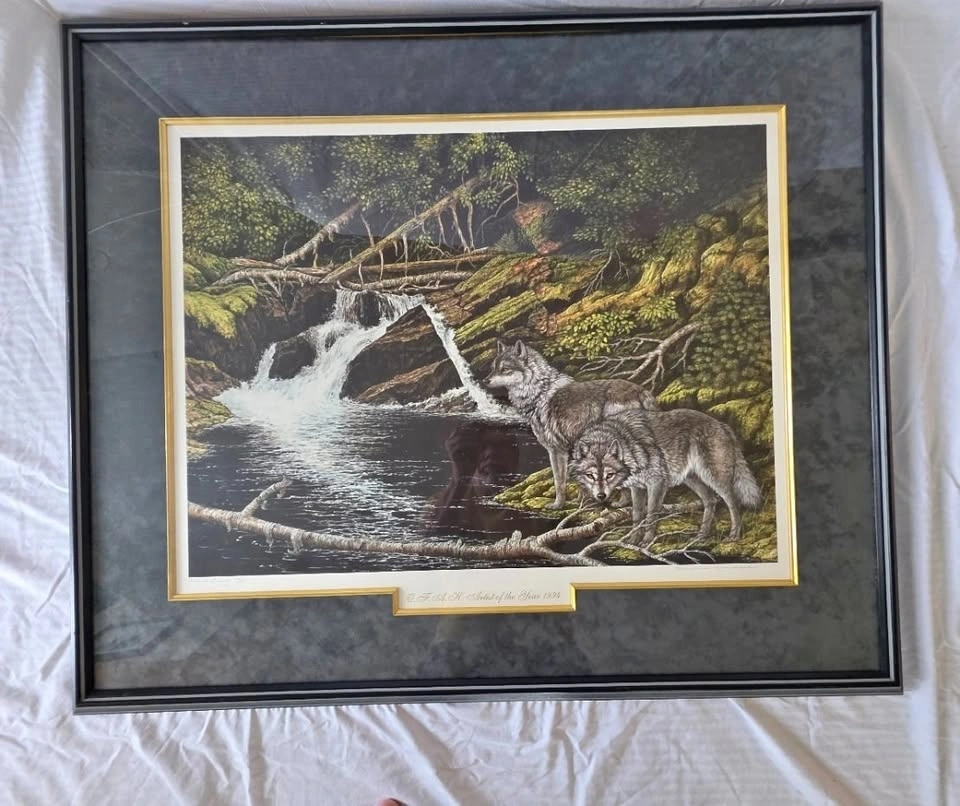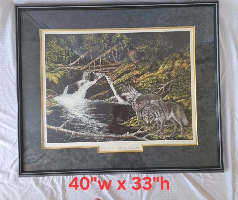 This is a framed wildlife print of a Christine Marshall painting, titled 'Wolves by River'. The detail and colors are stunning, capturing the wolves in their natural habitat. The print measures 40"w x 33"h.