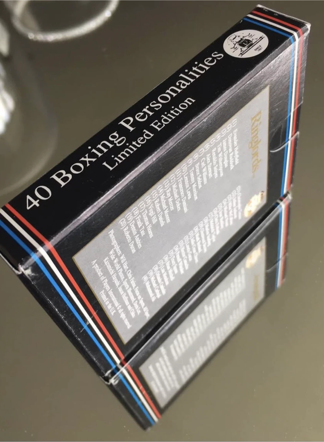 A limited edition set of 40 boxing personality cards by Ringlörds. Includes iconic boxers like Muhammad Ali and Evander Holyfield. Printed in the U.K. in 1991.