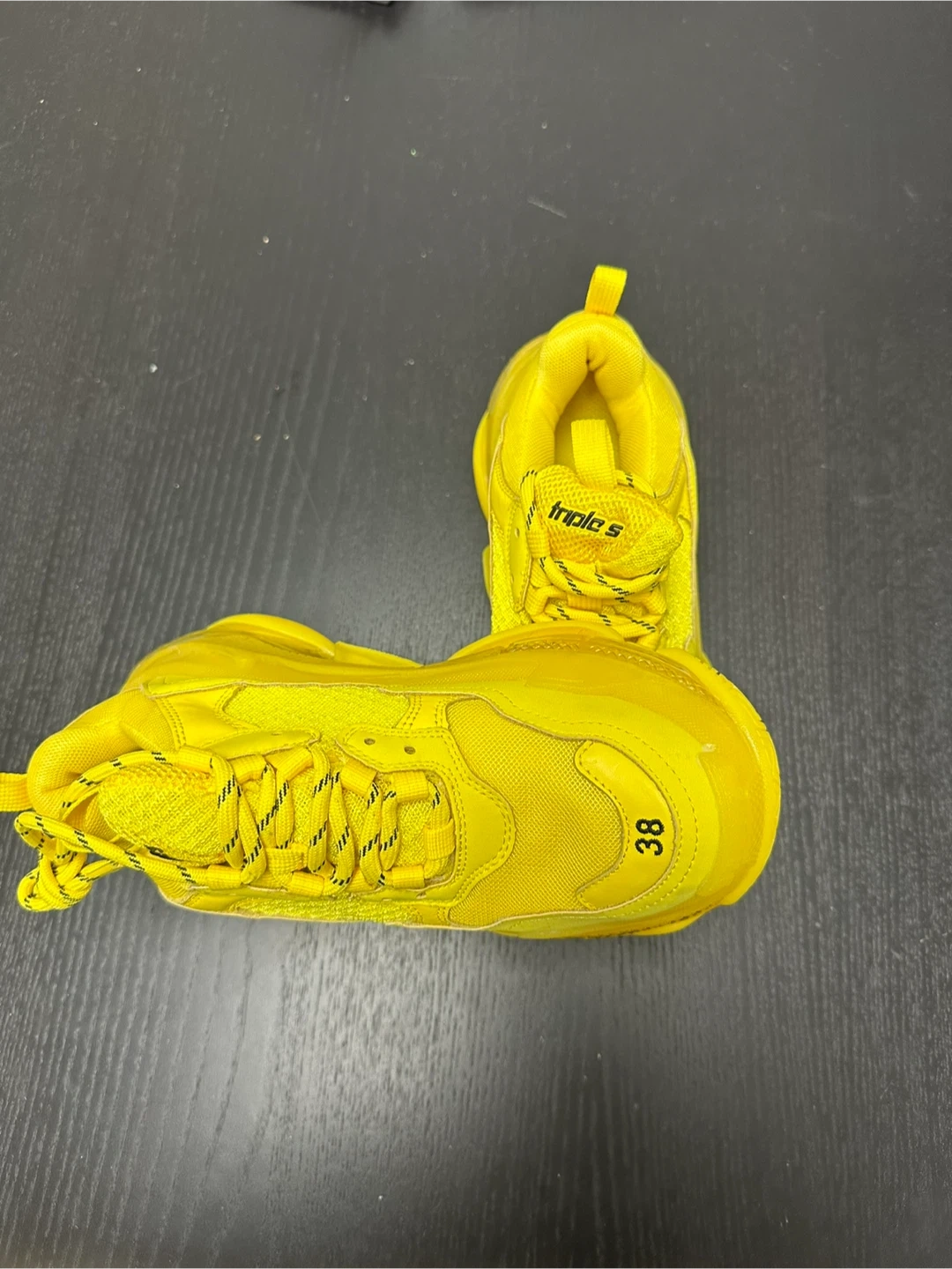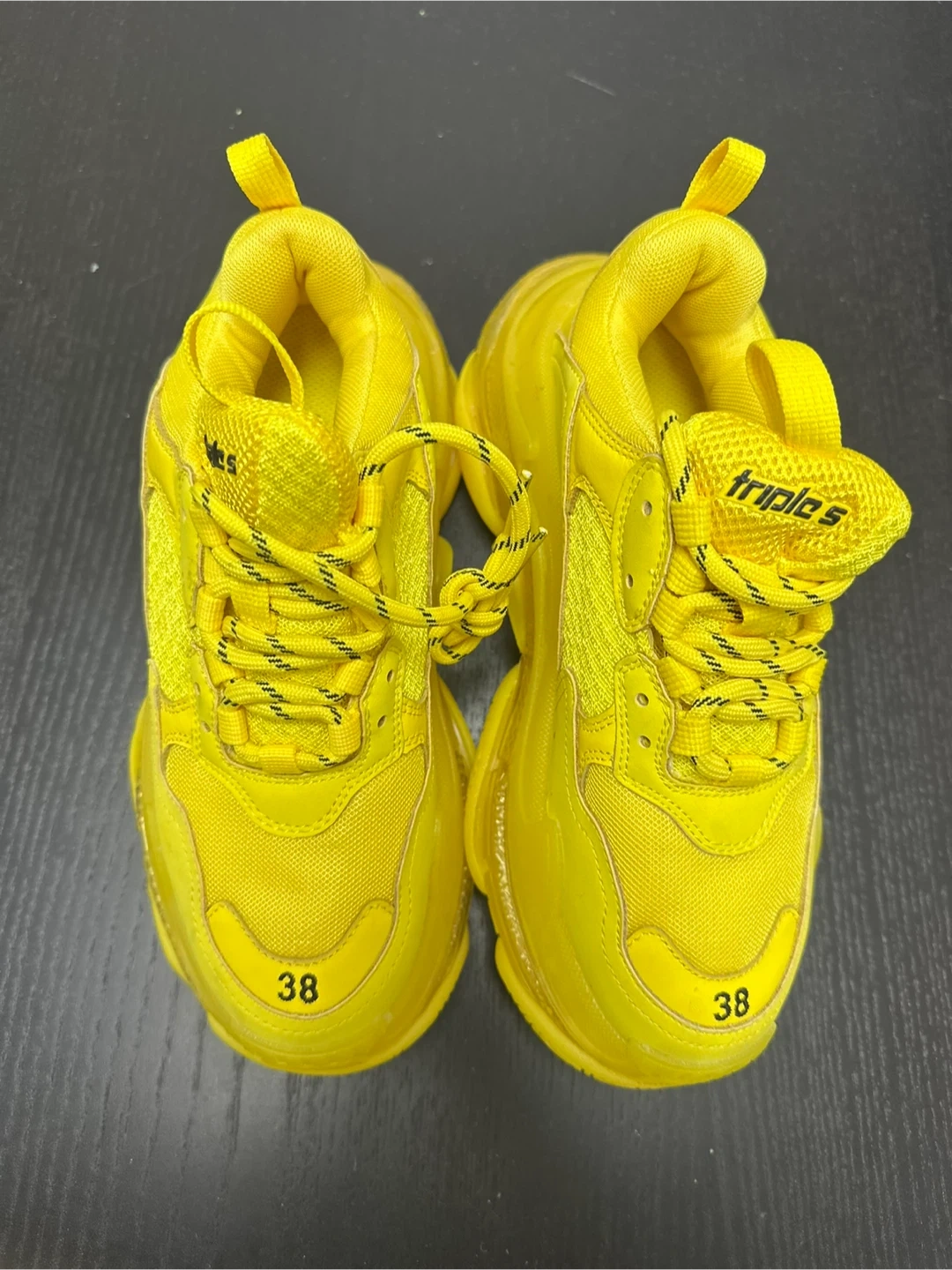 These are bright yellow Balenciaga Triple S sneakers. Size is 38. They're a bold statement piece!