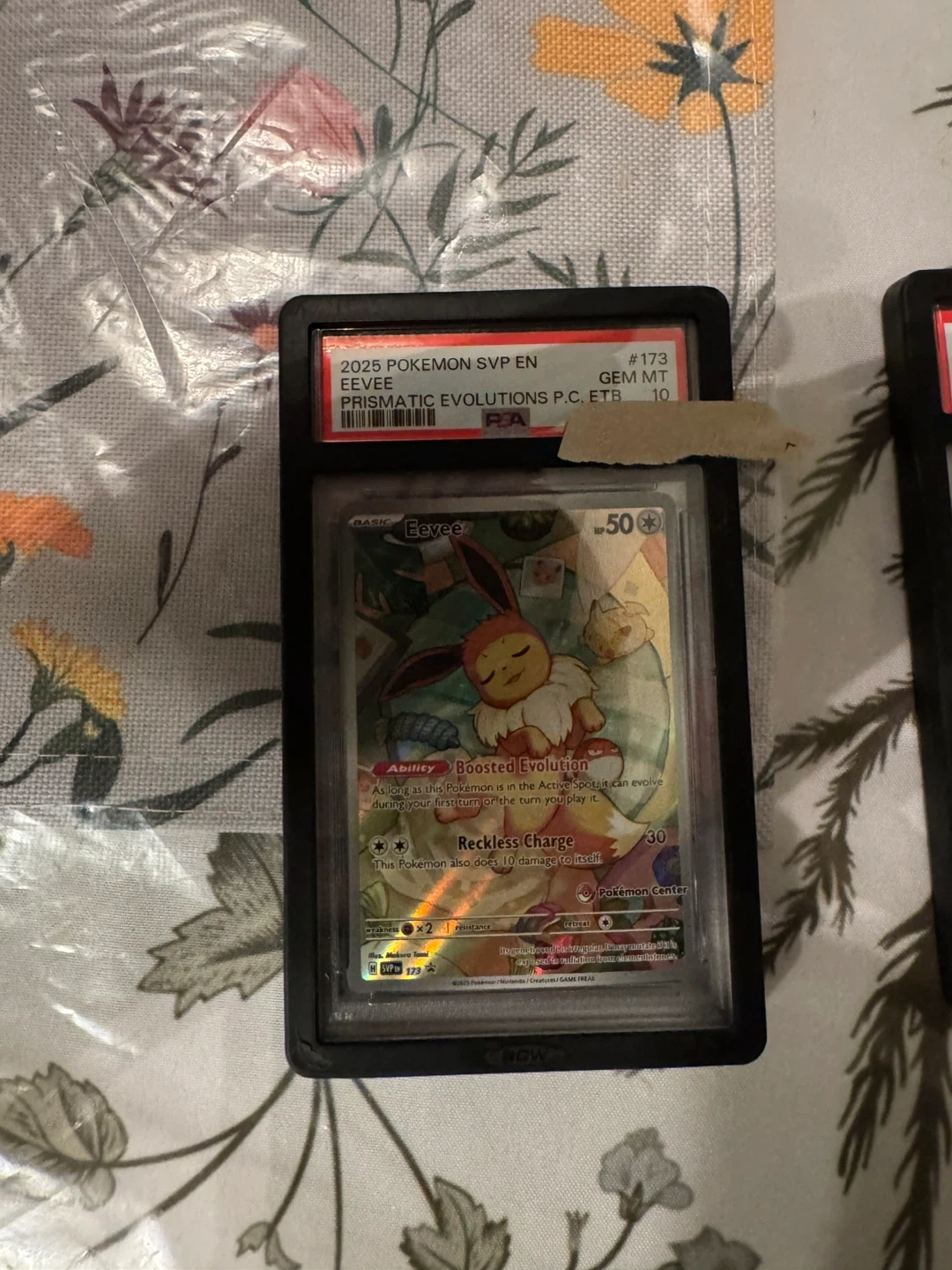 It's a 2025 Pokémon Eevee card, number 173 from Prismatic Evolutions. It's graded GEM MT 10. The card features the ability 'Boosted Evolution' and the attack 'Reckless Charge'. This would be a great addition for any Pokémon collector!