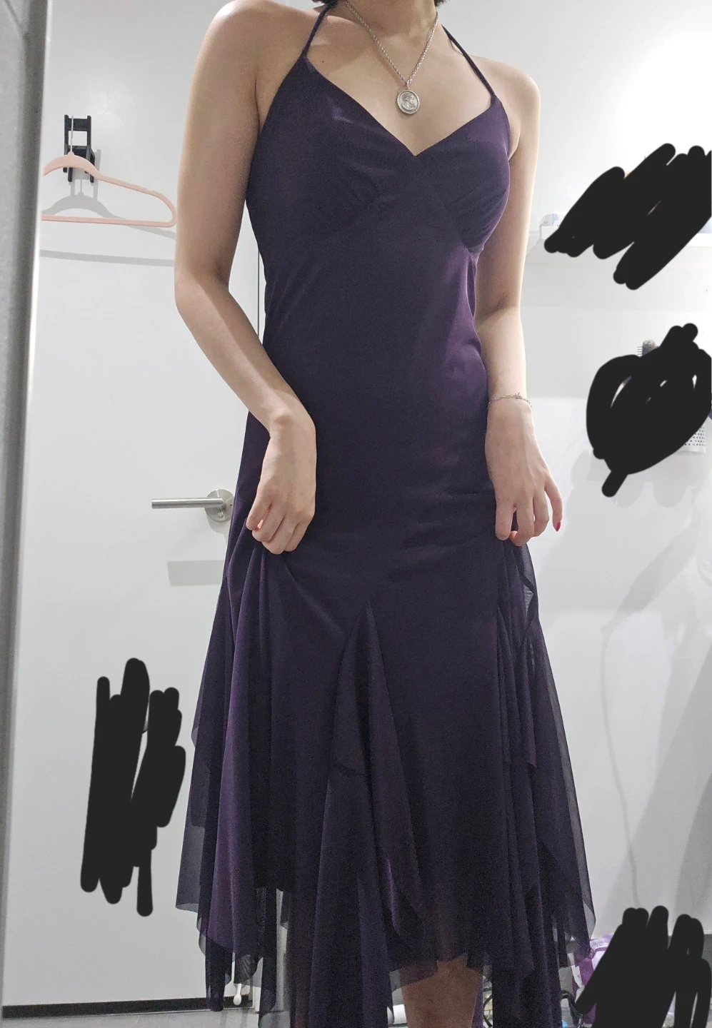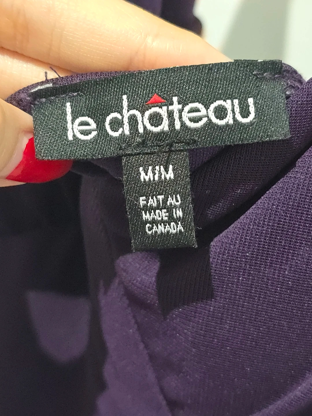 This Le Chateau dress comes in a striking purple hue with a flattering halter neck design. It's made in Canada and features a flowy, asymmetrical hemline with layered chiffon details. The fabric has a nice drape, perfect for special occasions.