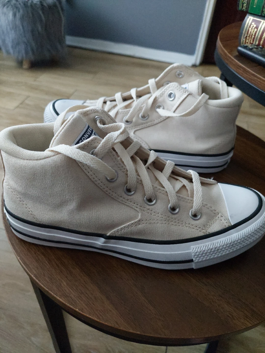 Classic Converse Chuck Taylor All Star mid-top sneakers in a neutral beige canvas. They feature a lace-up closure and the iconic rubber toe cap. Canvas upper and lining.