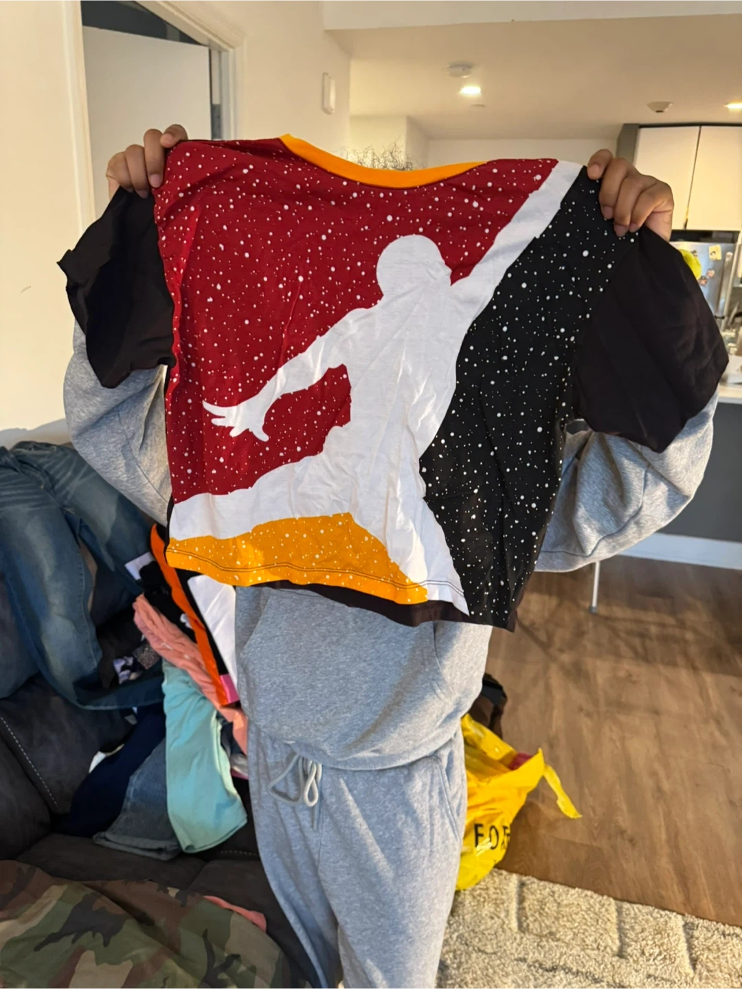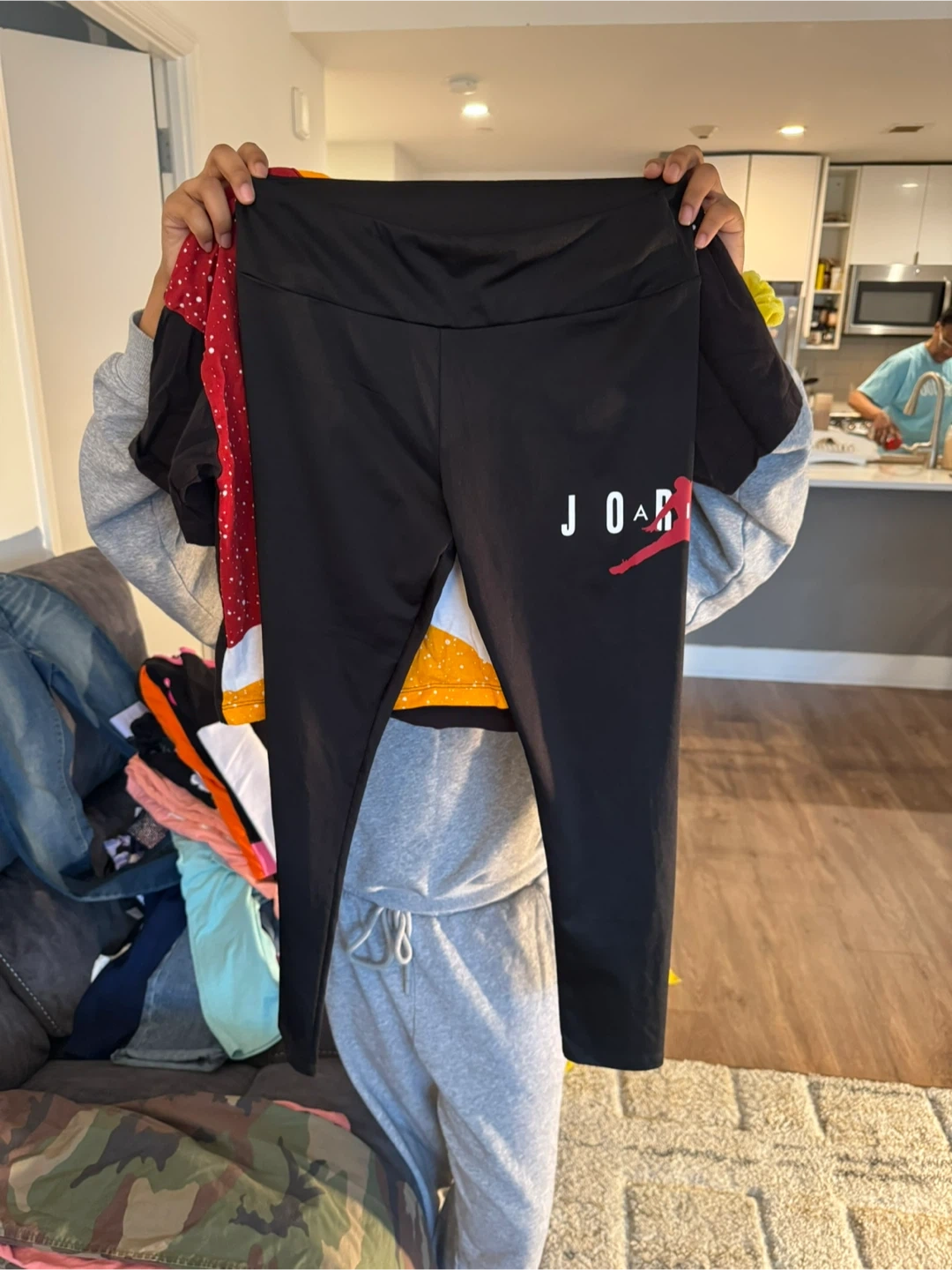 This is a Jordan brand t-shirt and leggings set. The t-shirt features the iconic Jumpman logo with a speckled design. The leggings are black with a Jumpman logo detail.