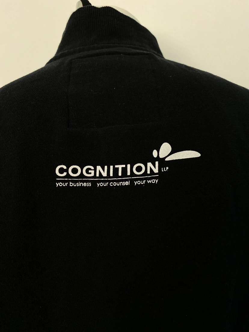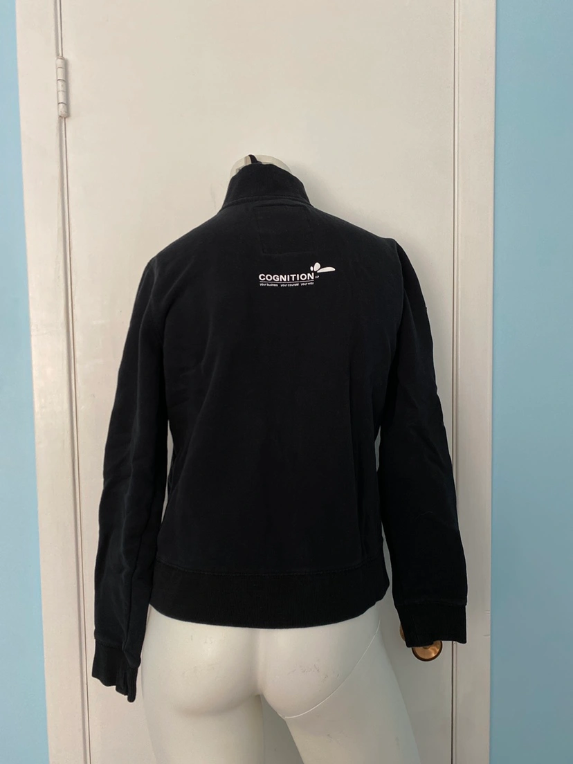 Navy Blue Roots Sweater with company logo. Perhaps you can place something over it or take it off.