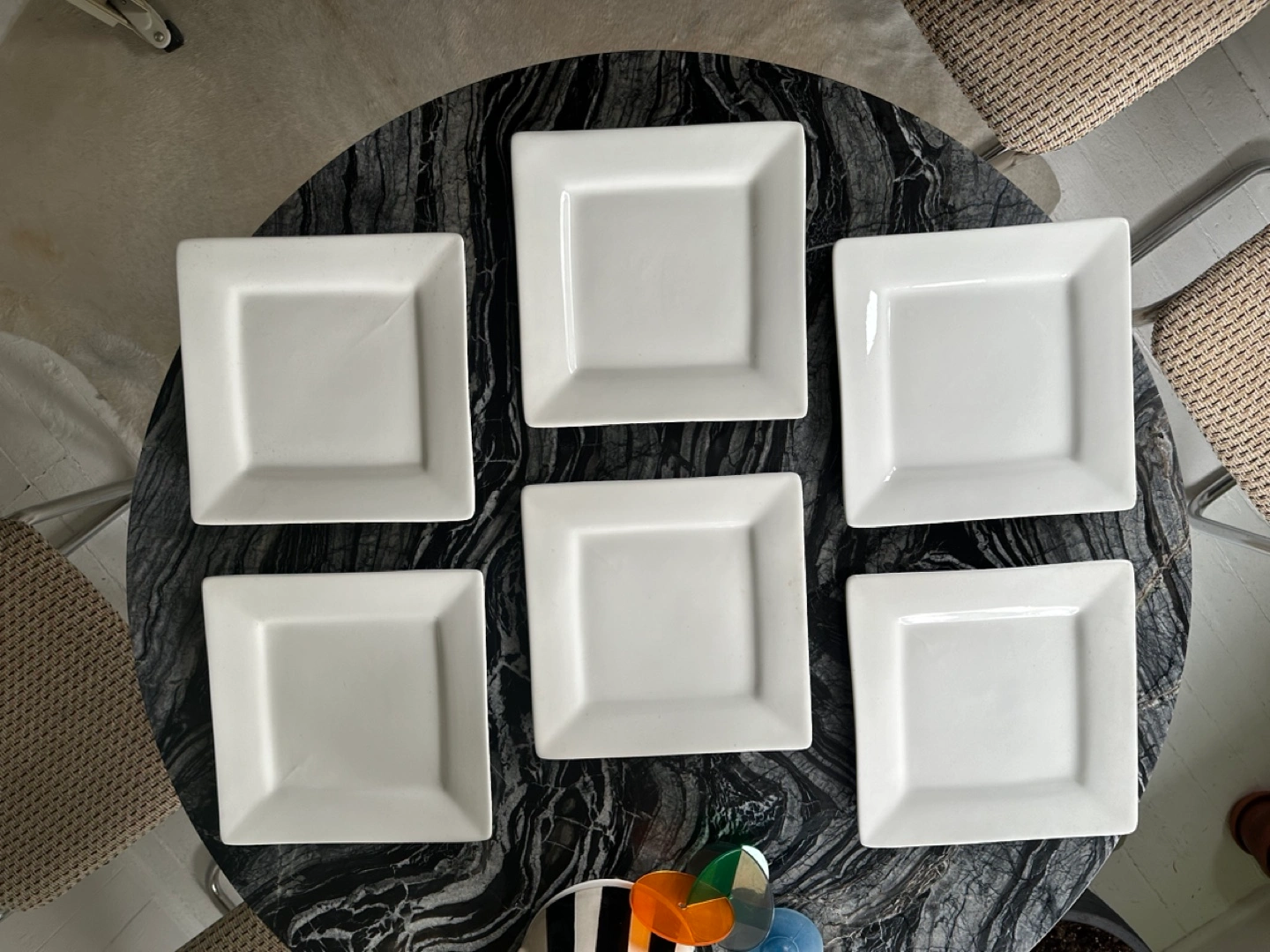 FREE Set of 6 white porcelain square dinner plates. They’re super cute but just don’t match my aesthetic anymore and i need to declutter ! :)
