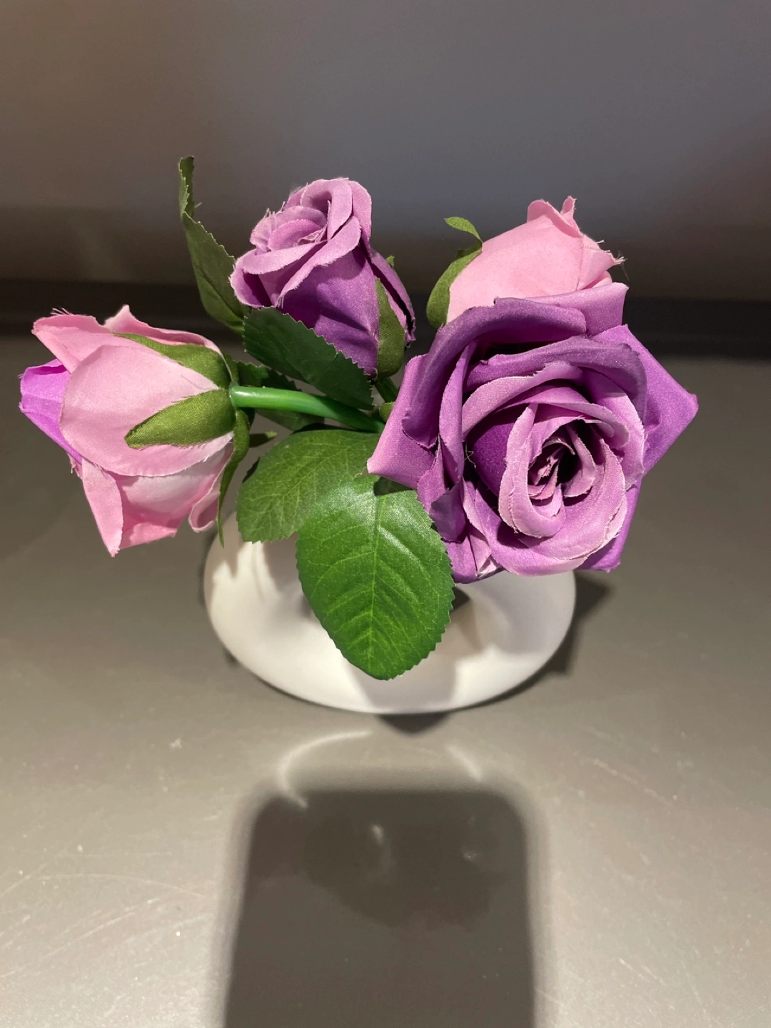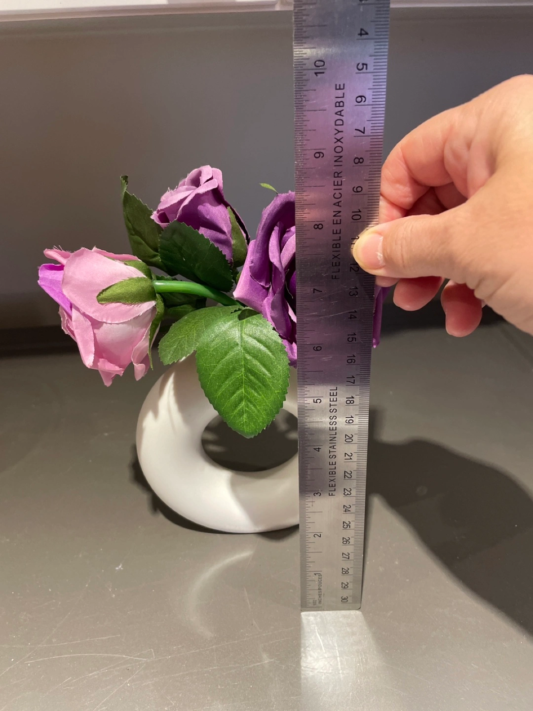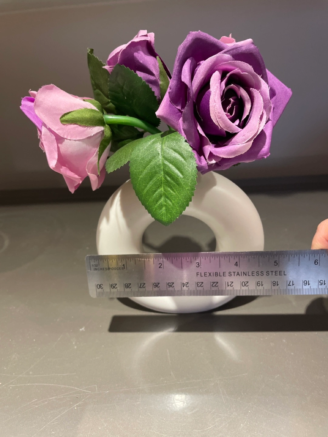 White plastic vase, shaped like a donut with artificial flowers Approximately 5 inches in diameter.