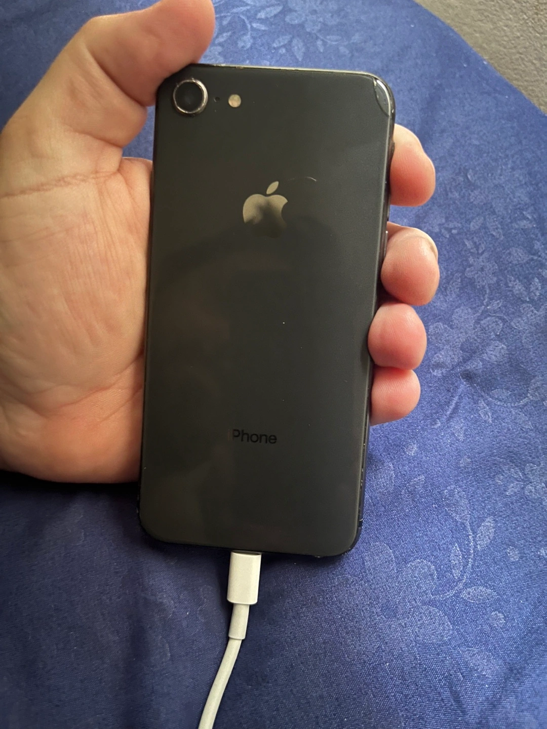 Grey iPhone 8 with 64GB storage. Comes with case, off brand lightning charging cable and apple block.