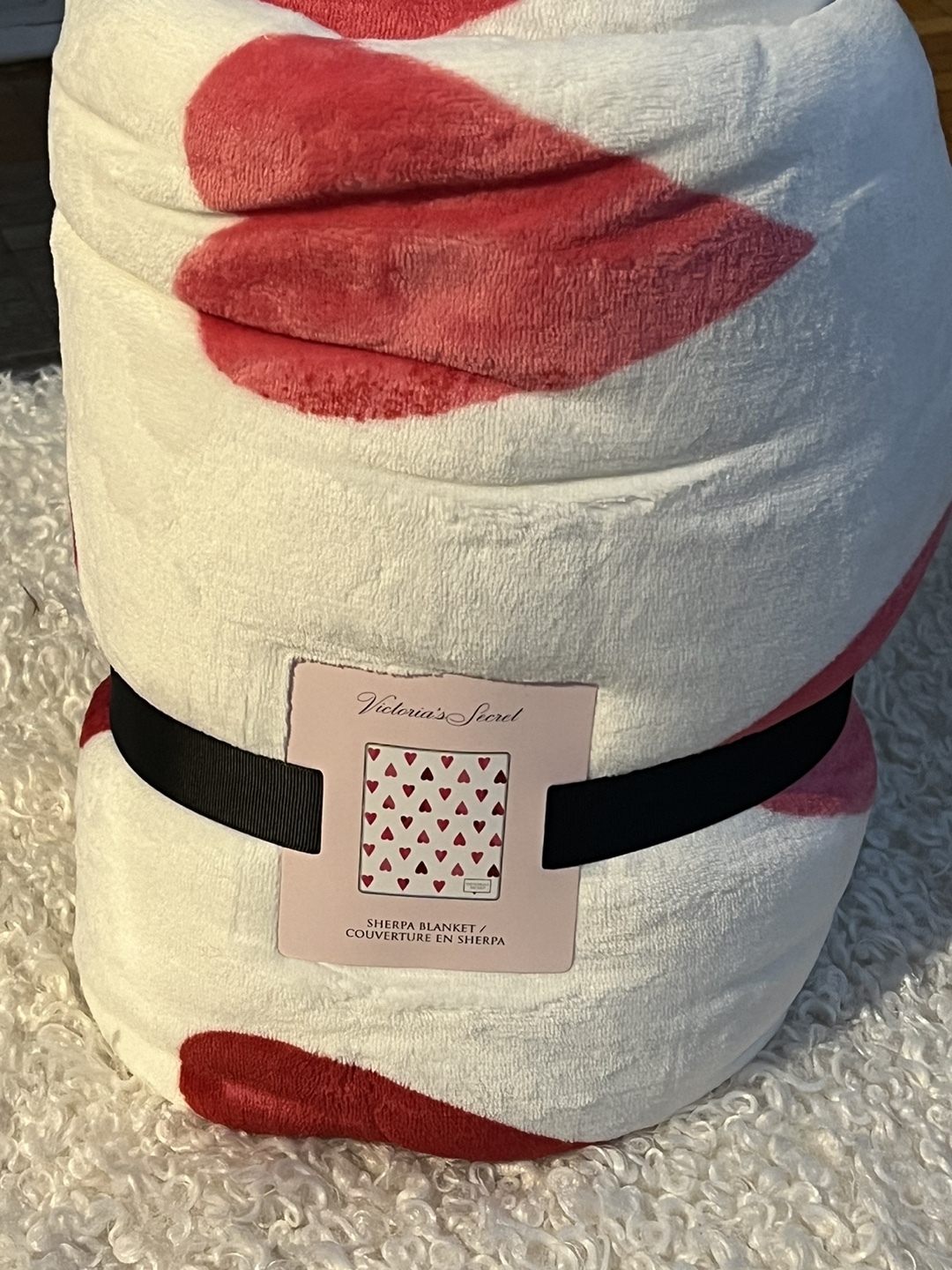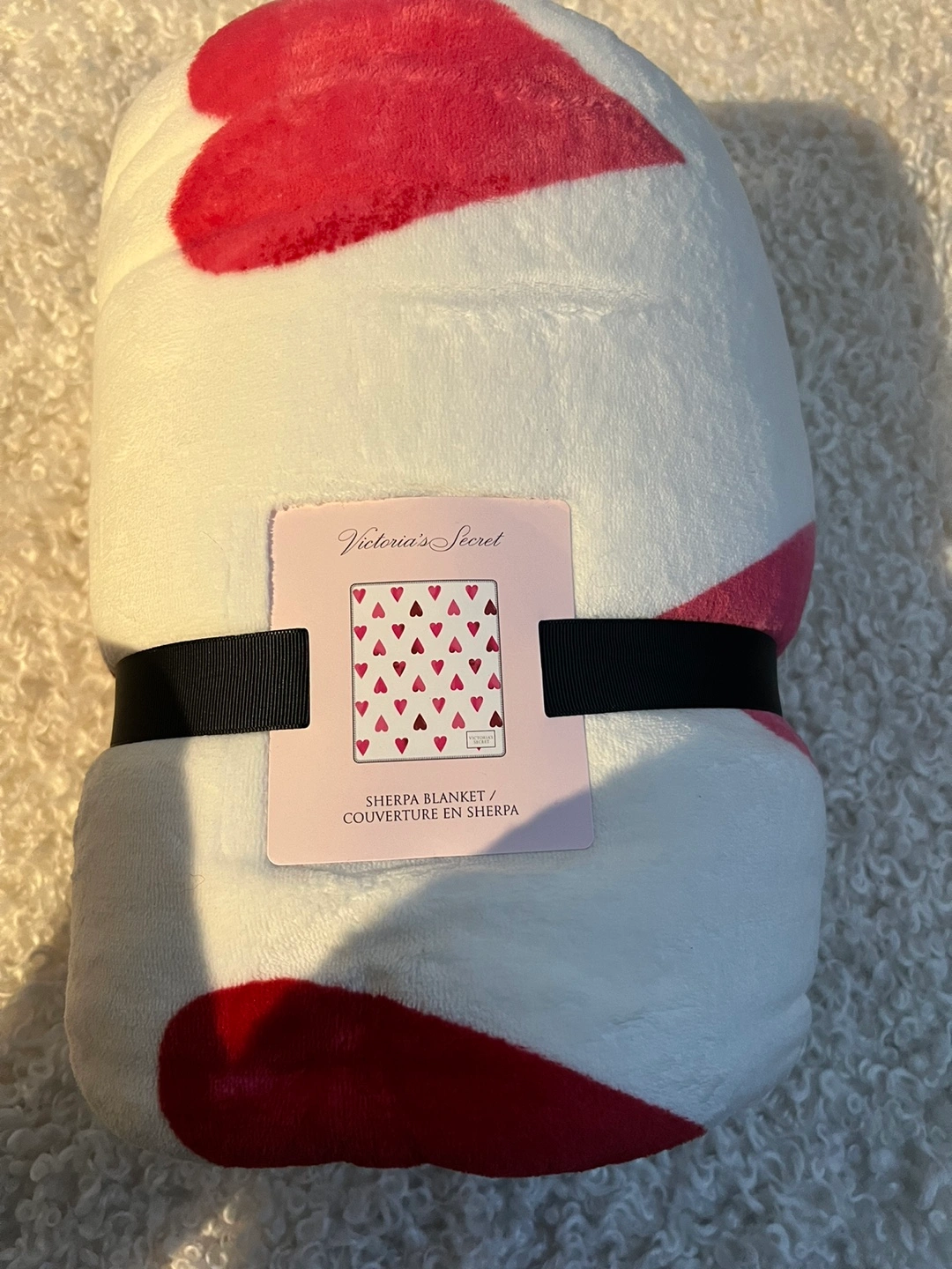 Sherpa blanket with large hearts on one side and a pattern of smaller hearts on the other. New with tags. 50in x 60in.