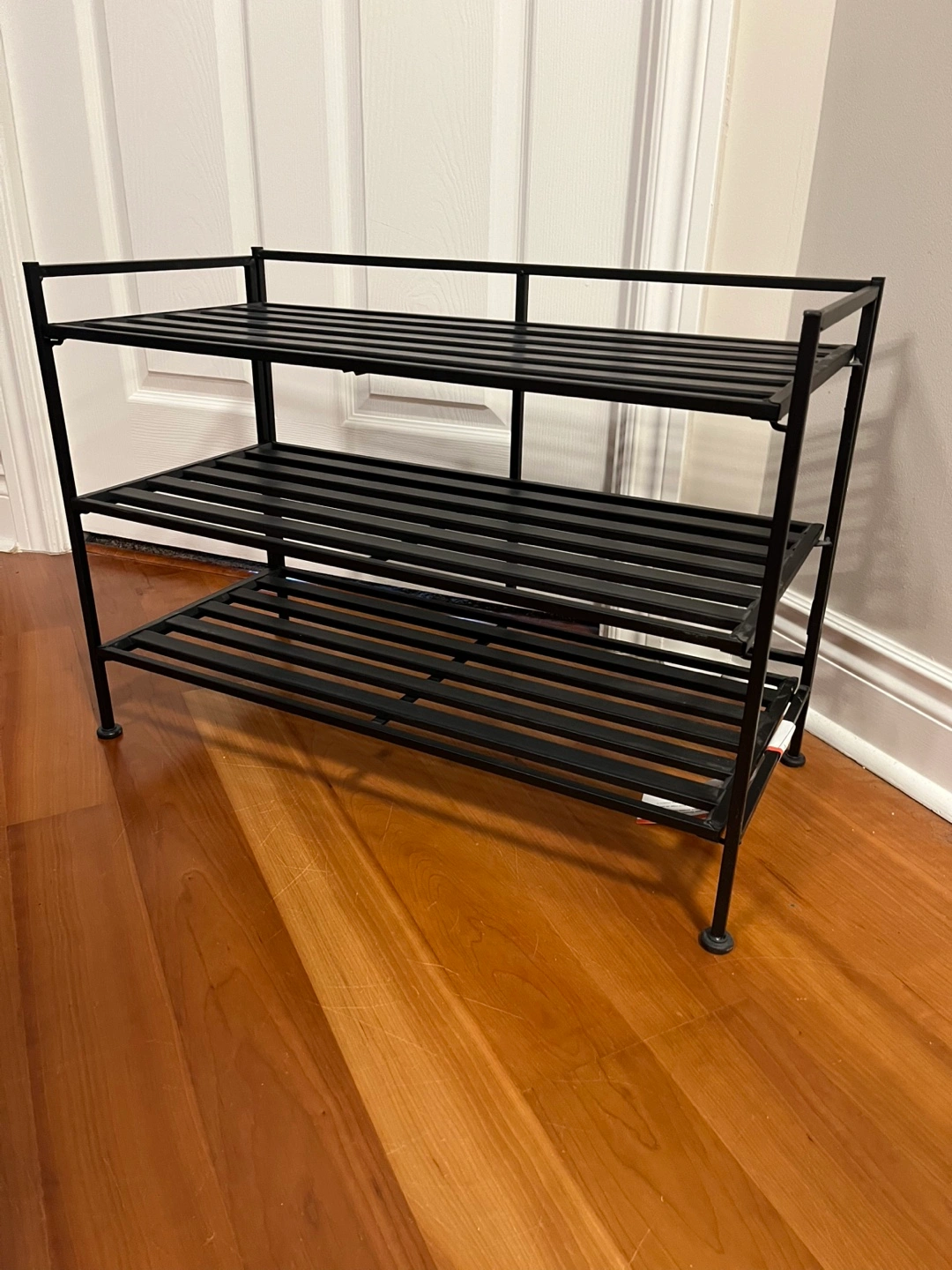 Black metal shoe rack with three tiers. Great for storing shoes or other small items.