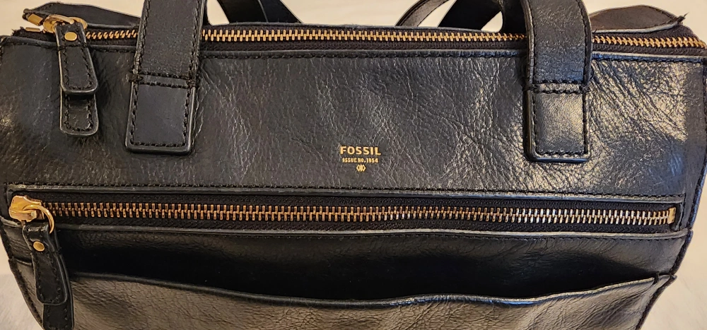 Black leather tote bag with gold hardware. Interior features a zippered pocket and a slip pocket.