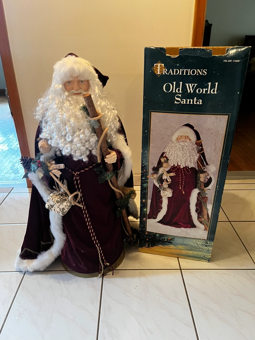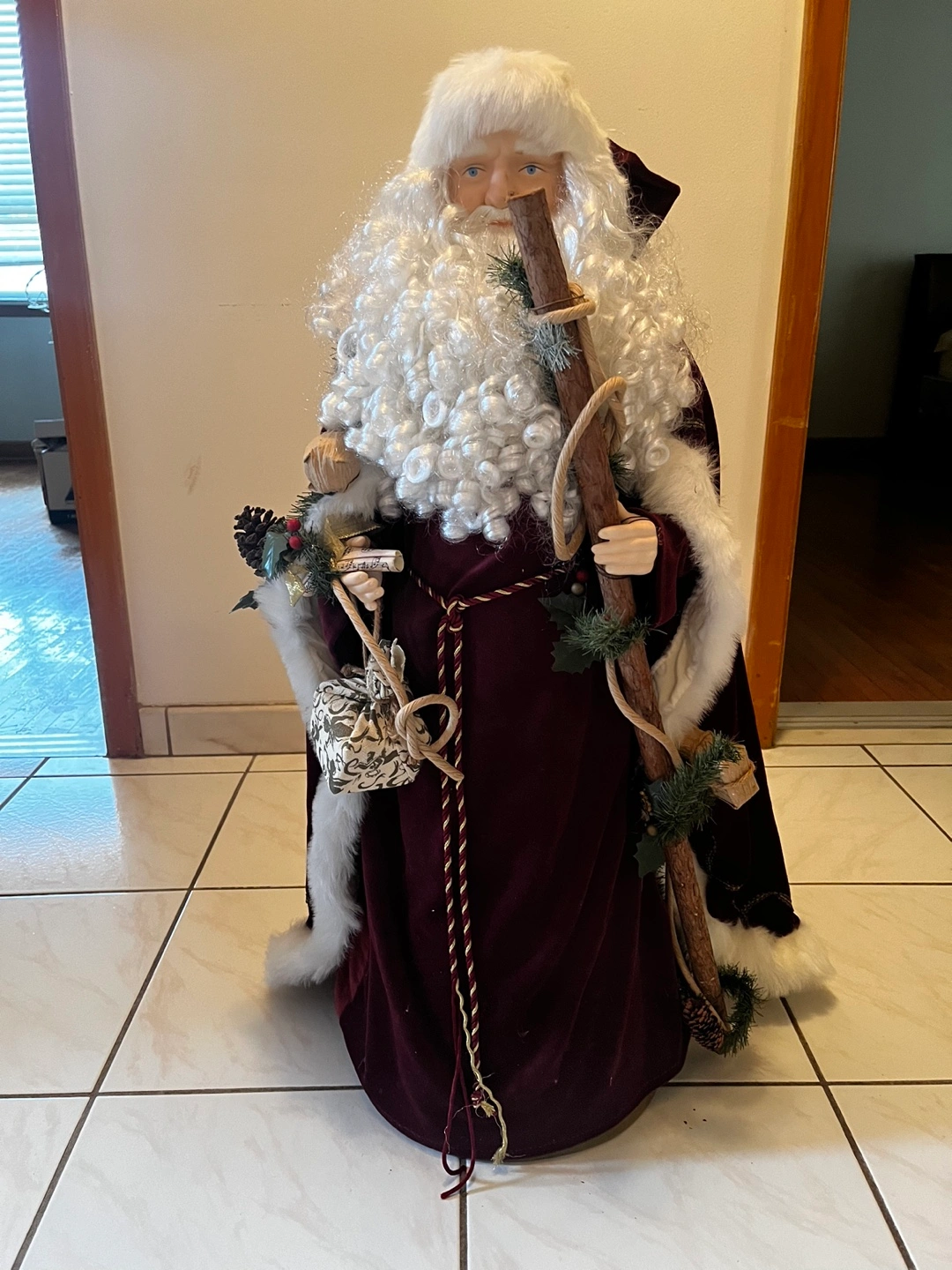 Large Santa Claus figurine, burgundy velvet robe, white fur trim, holding a stick. Comes in a box with a printed image of the Santa on the front.