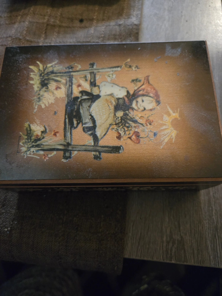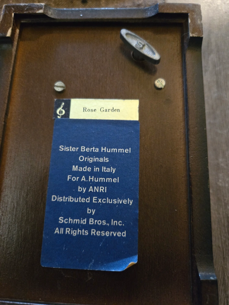 Vintage music box featuring a Sister Berta Hummel design. Rose Garden. Made in Italy. Plays music when the key is turned.