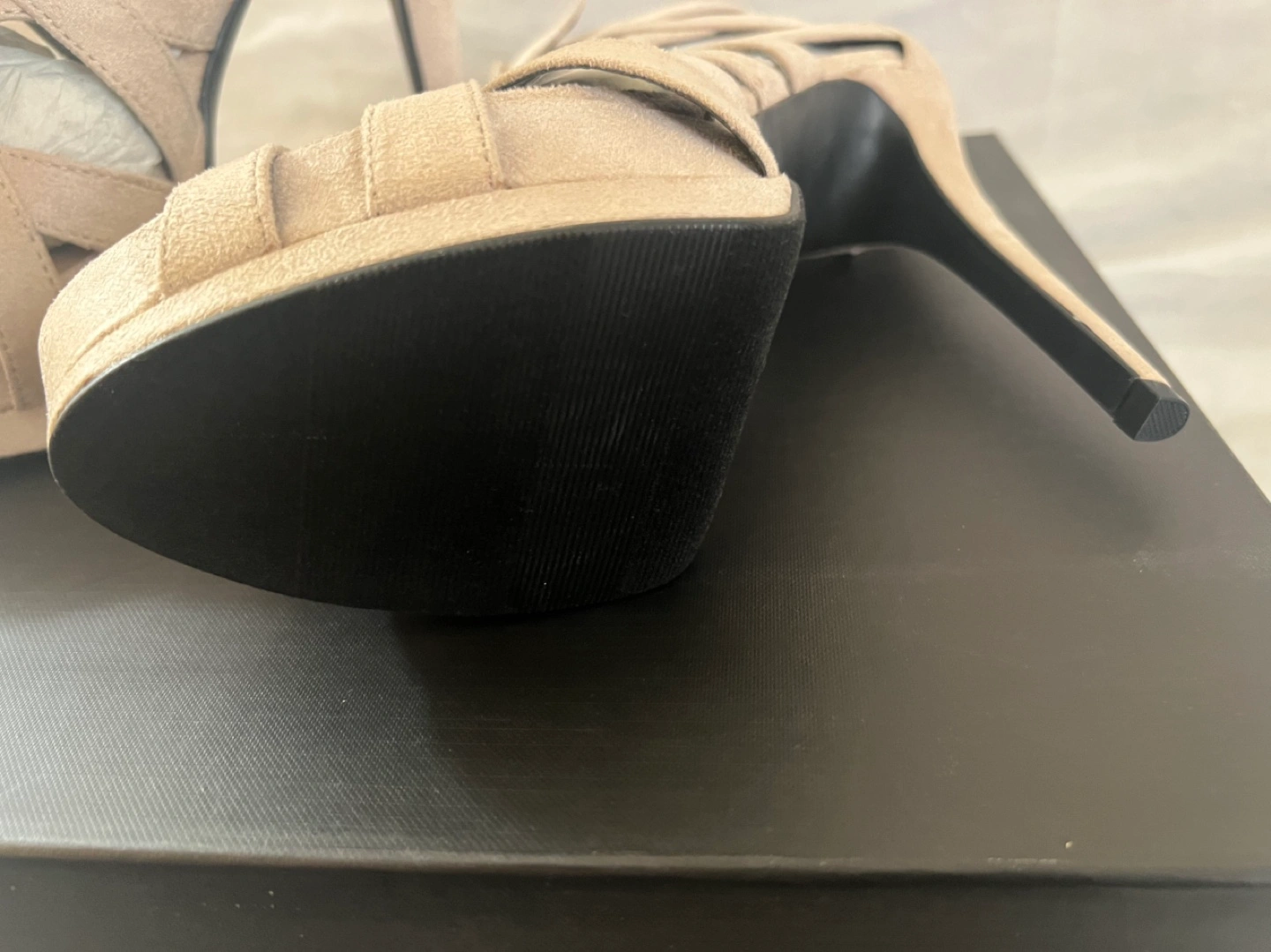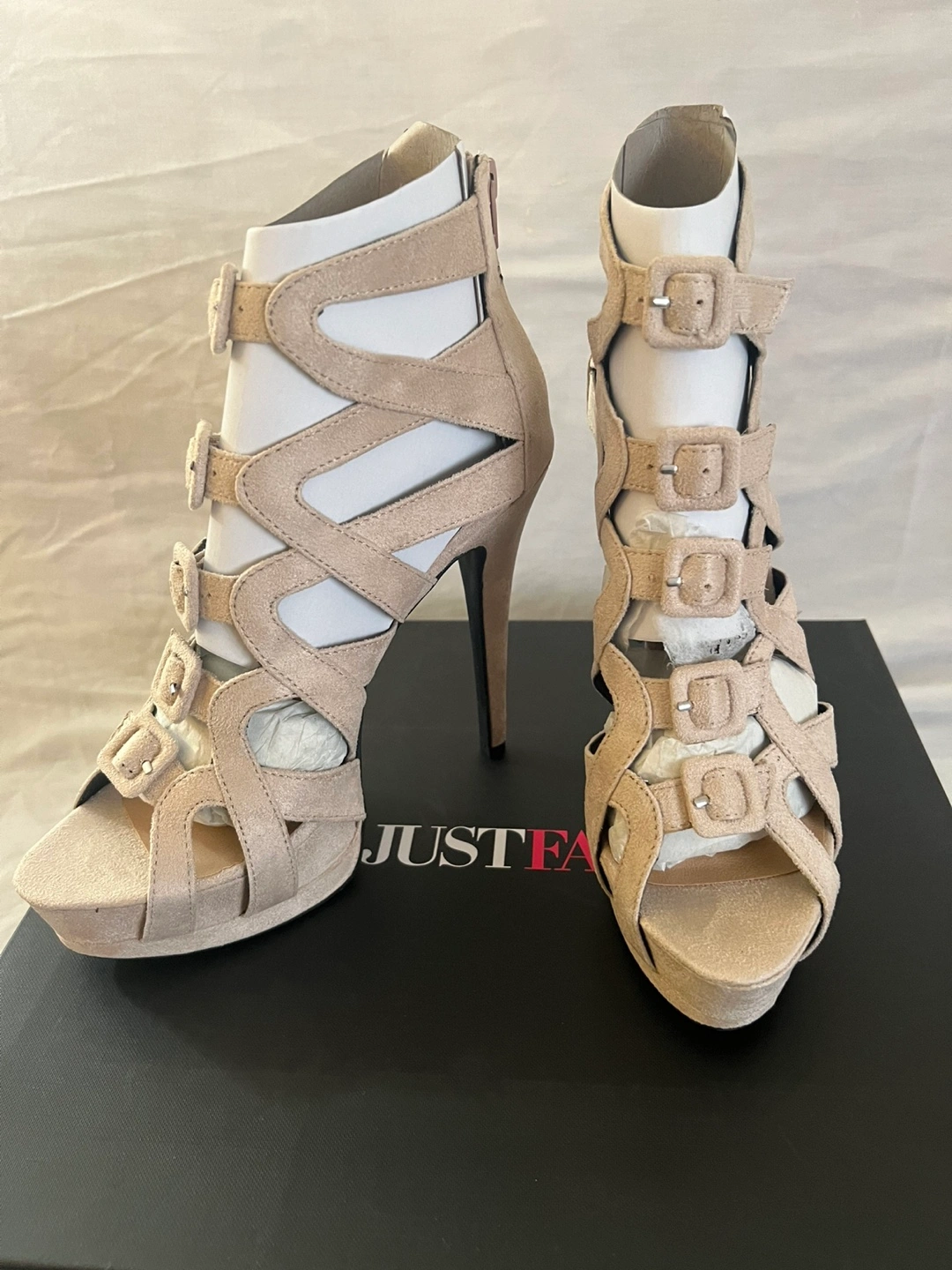21Beige suede sandals with multiple buckles. Open toe, high heel. Platform sole. Come in original box.