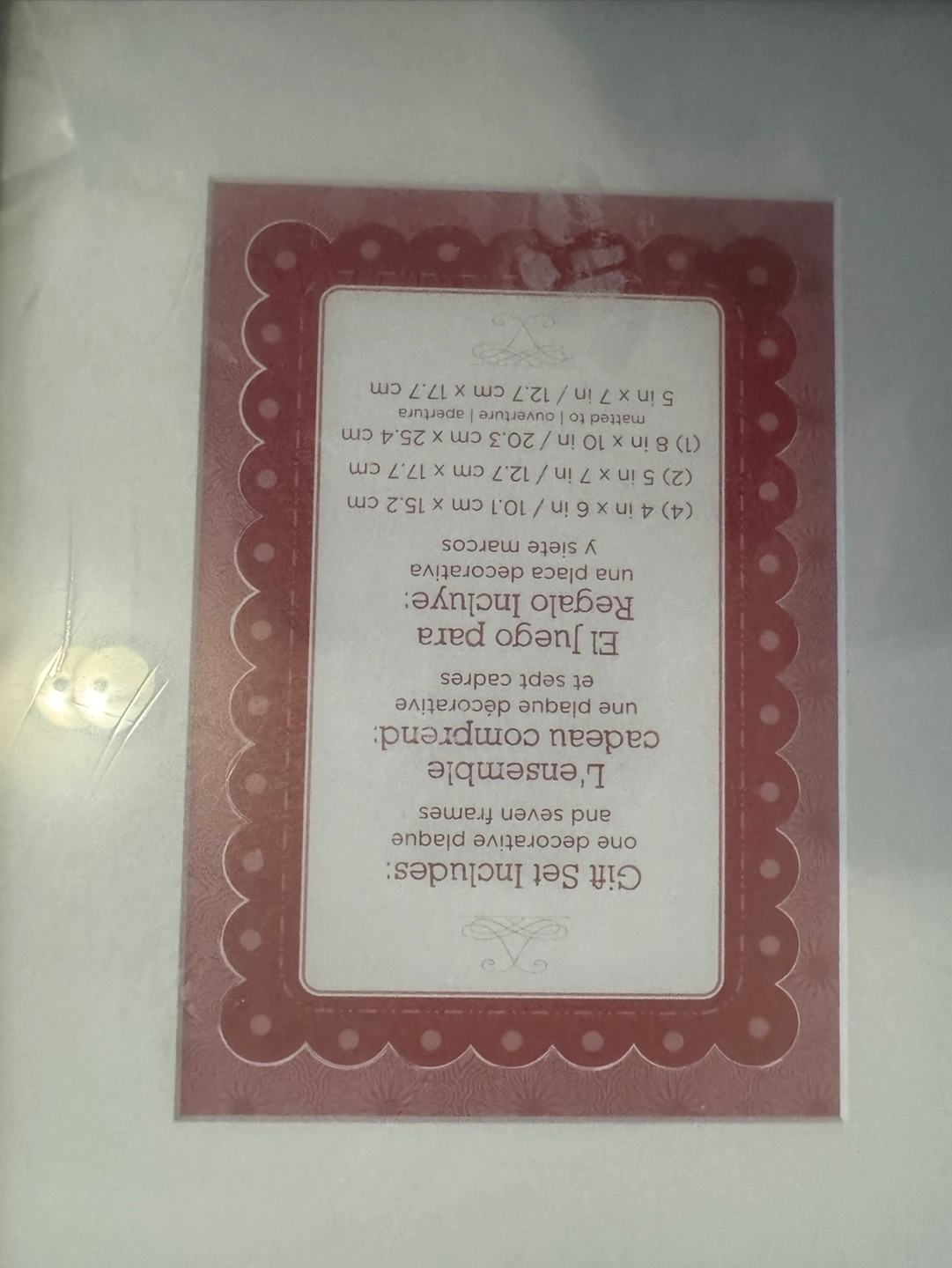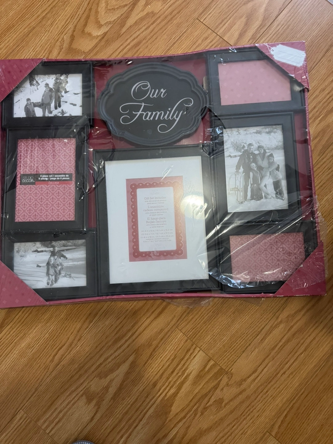 Seven piece picture frame set. One decorative plaque and seven frames. Includes four small frames, two medium frames and one large frame. Measurements of each frame in picture.