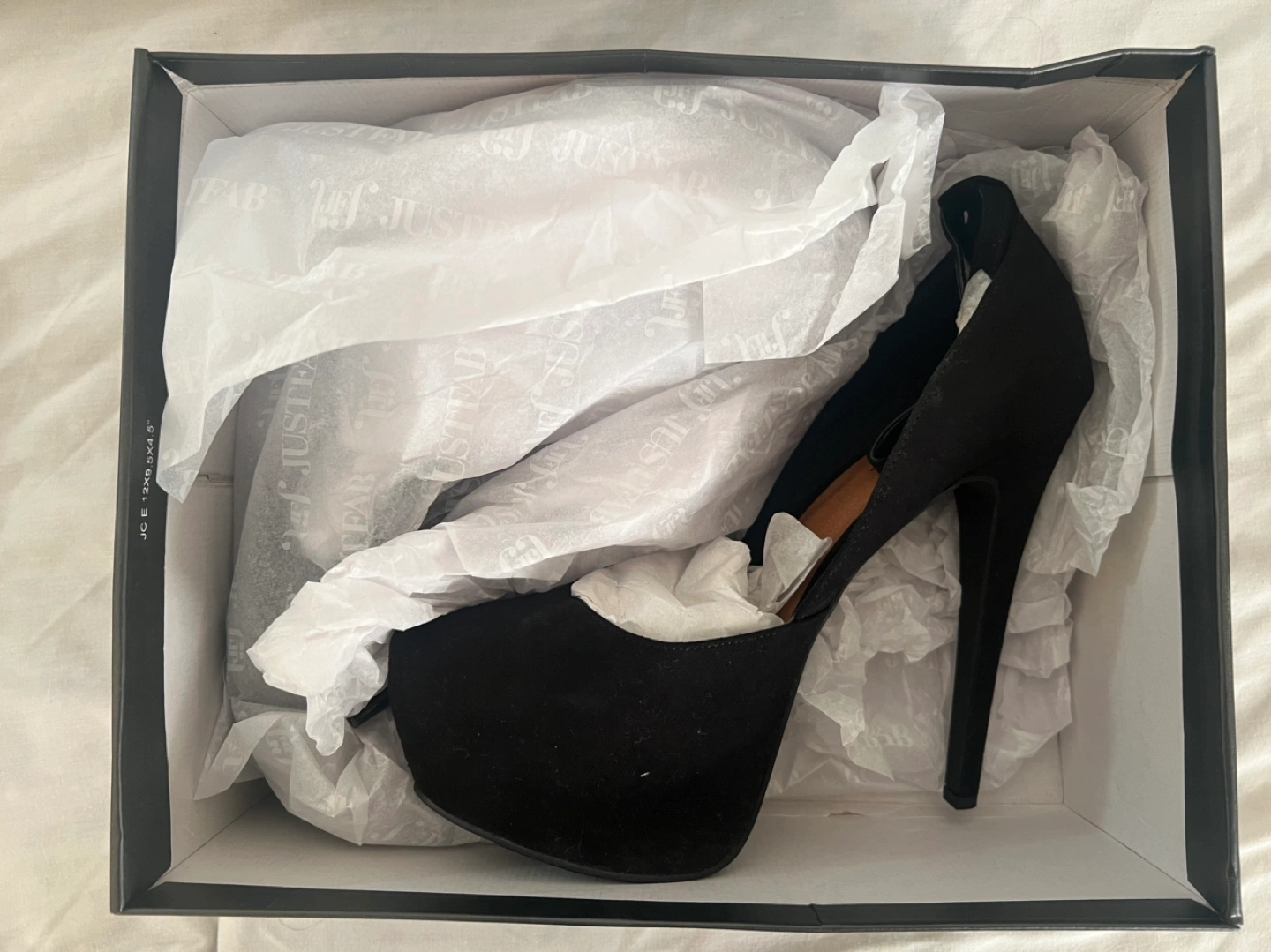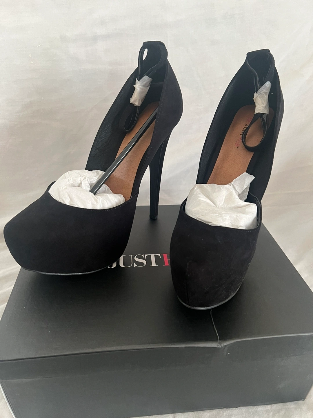 21Black suede platform heels. Ankle strap with buckle closure. High heel.