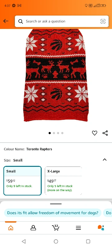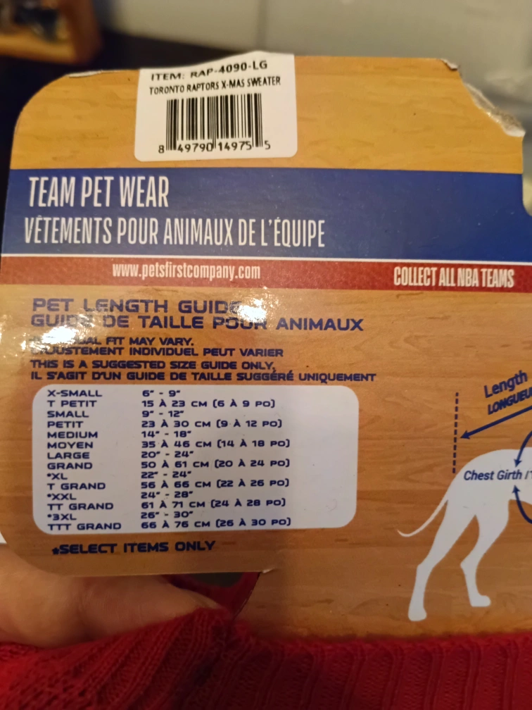 Red and black sweater with Raptors logo and reindeer design. Size Large. New with tags.