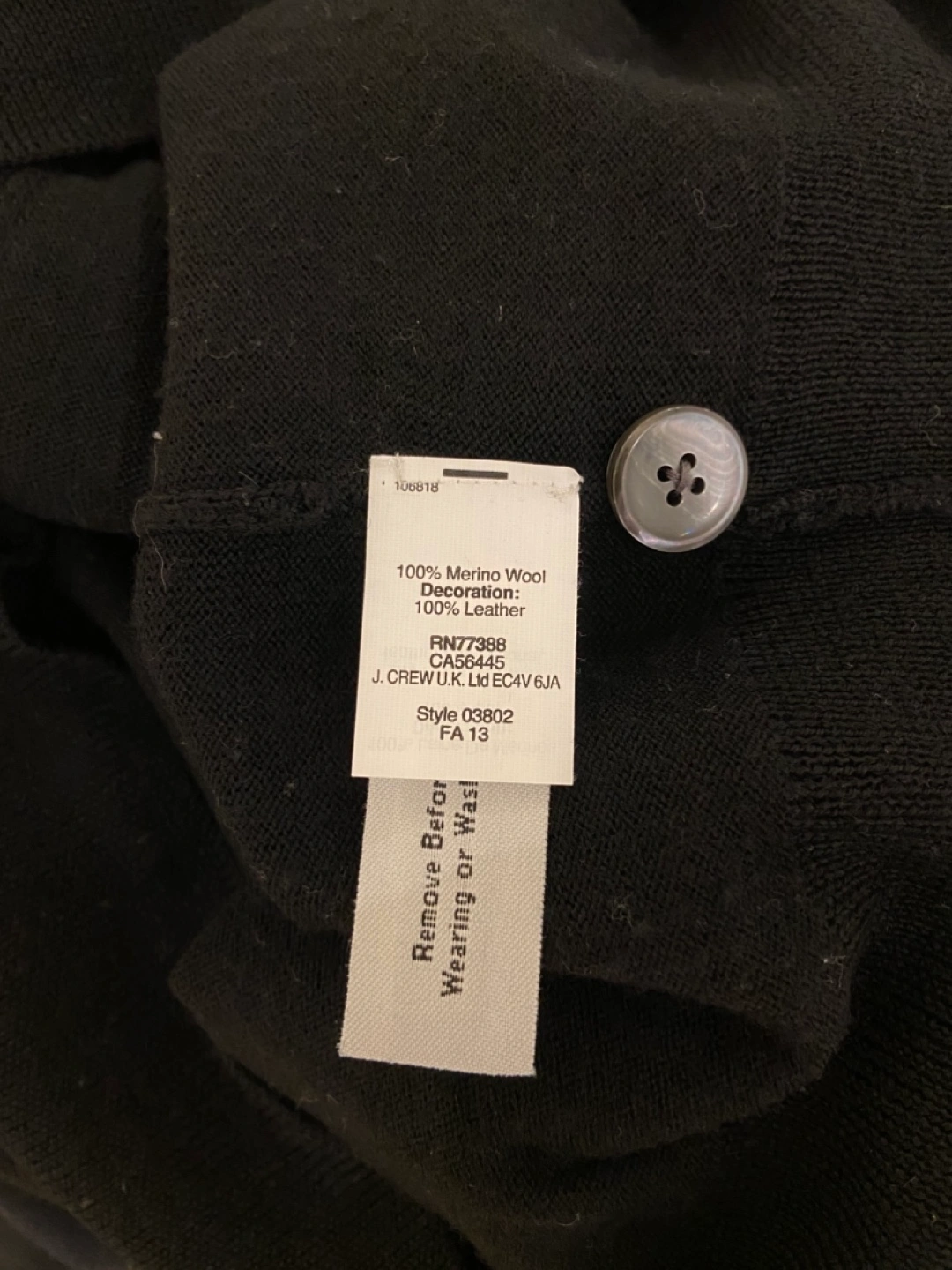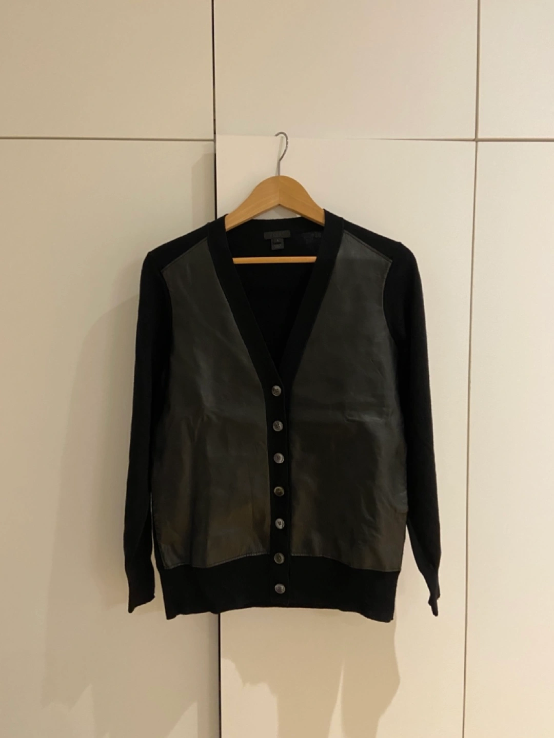Black merino wool cardigan with leather trim. Size S. J crew Black cardigan with leather Flat shoulder: 15 inches Chest: 19 inches Length:25 inches Sleeve: 23 inches