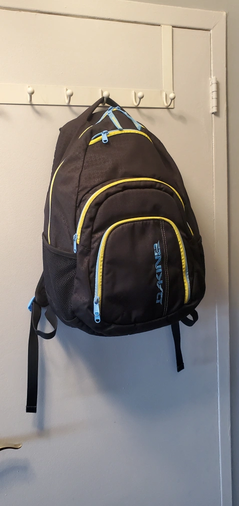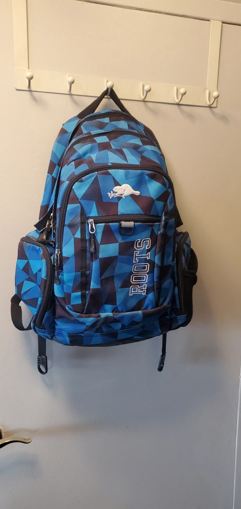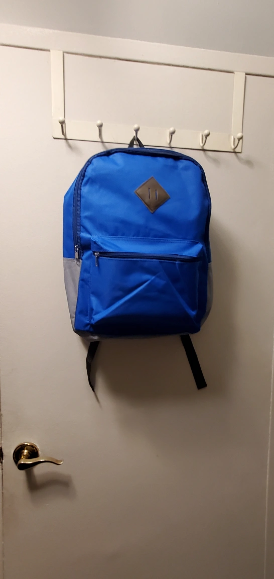 Blue and grey backpack. Two front zipper pockets. One large main compartment. One laptop sleeve. Adjustable straps.