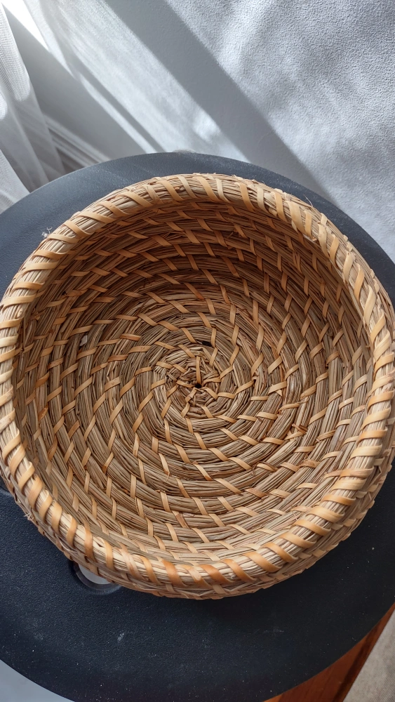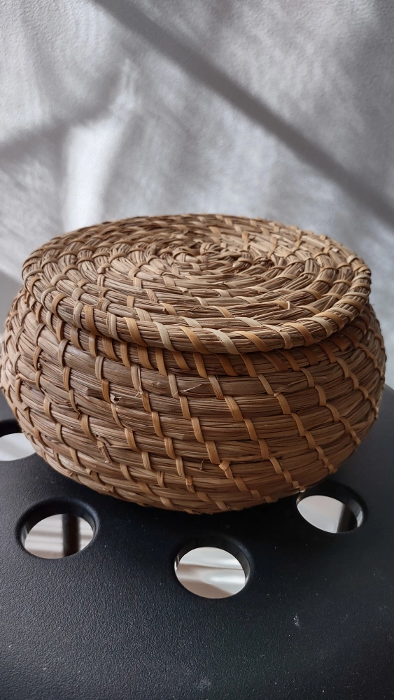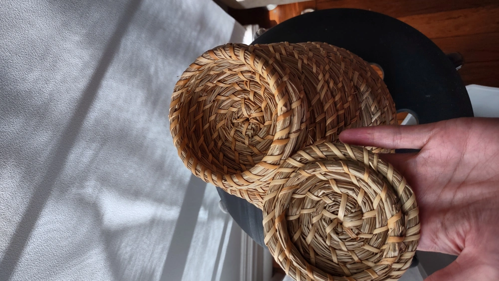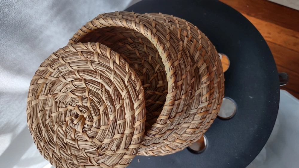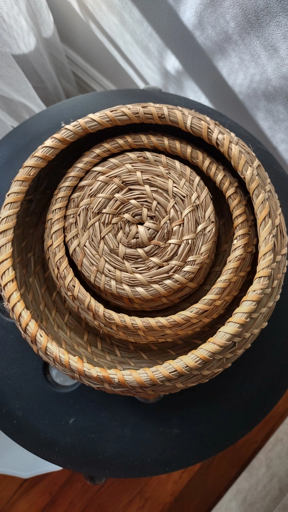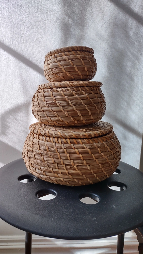 Set of 3 woven seagrass baskets with lids. Small to large great for storage and shelf display. Can be nested when not in use