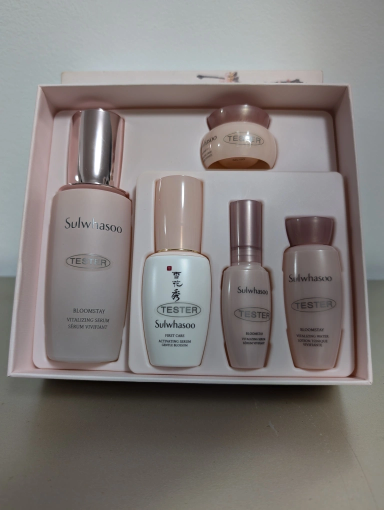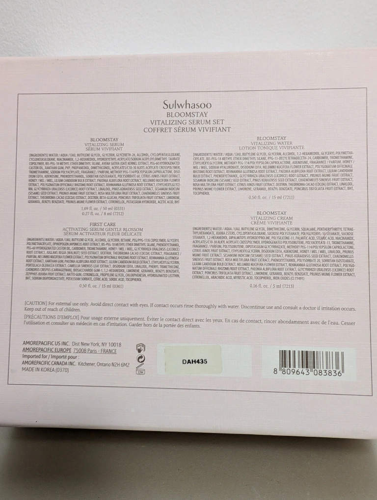 213Sulwhasoo Bloomstay Vitalizing Serum Set. Contains: Bloomstay Vitalizing Serum, Bloomstay Vitalizing Water Lotion, Bloomstay First Care Activator, Bloomstay Vitalizing Cream.