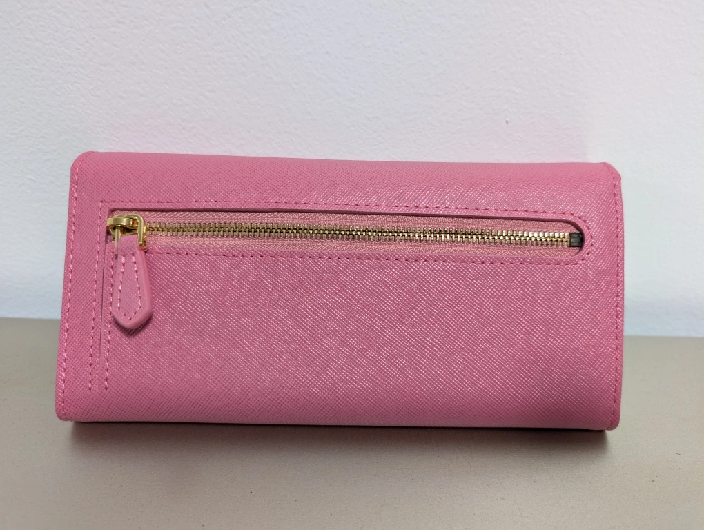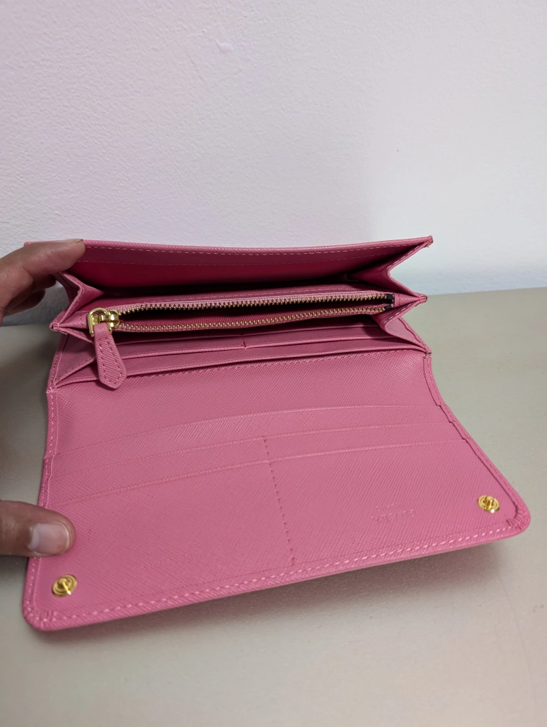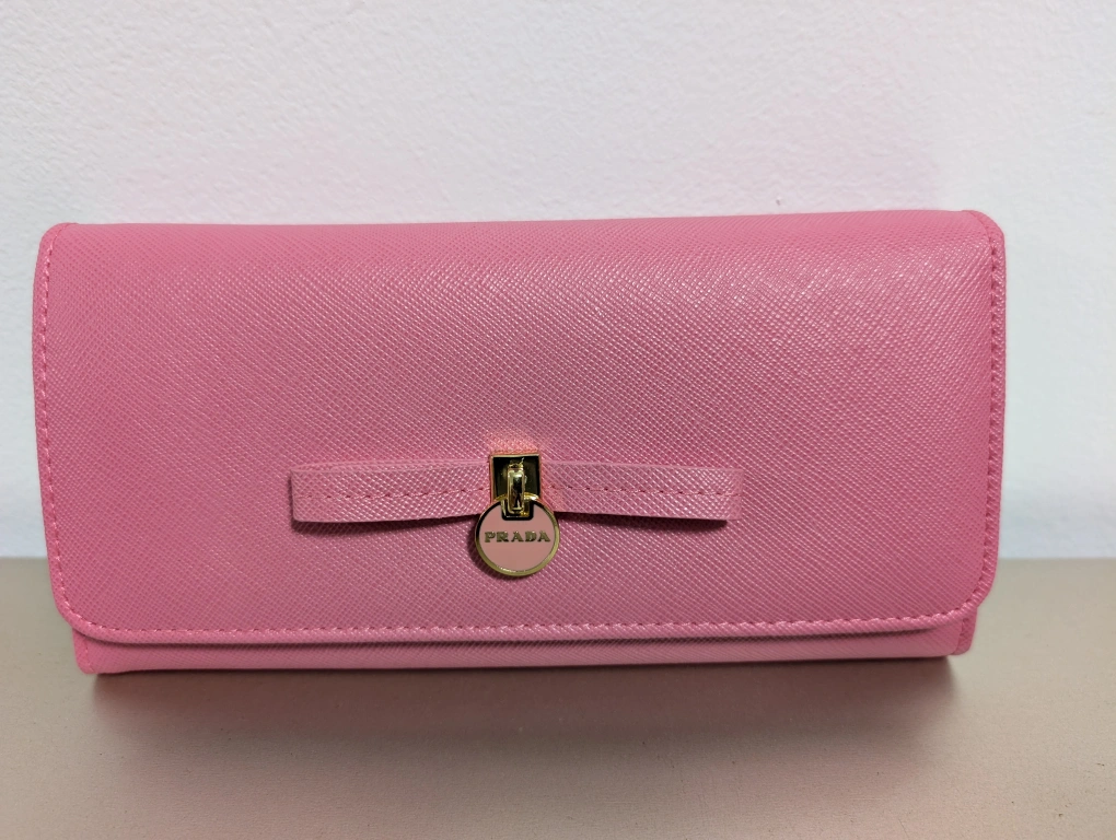 213Pink leather wallet with gold hardware. Comes with box.