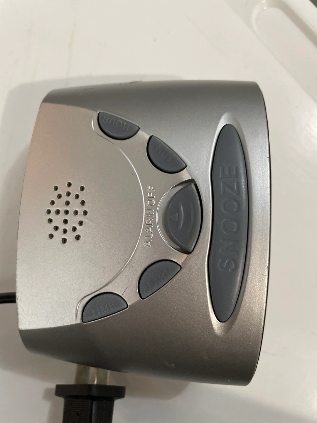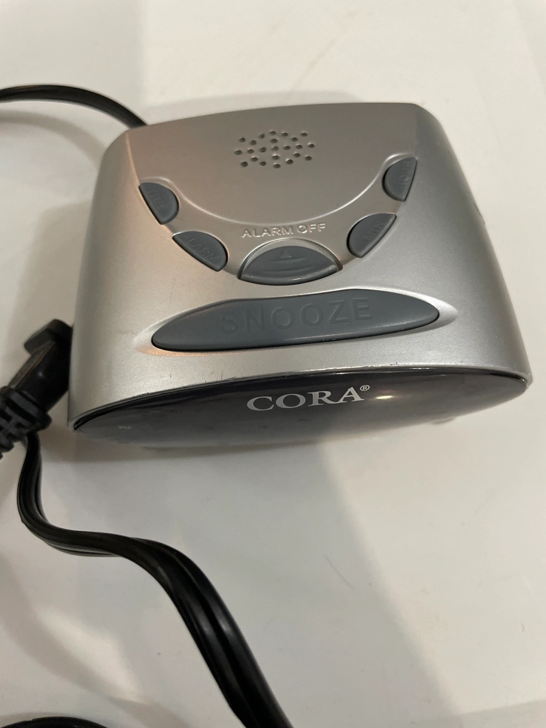 Cora alarm clock, silver, with snooze button, time, alarm, and light settings.