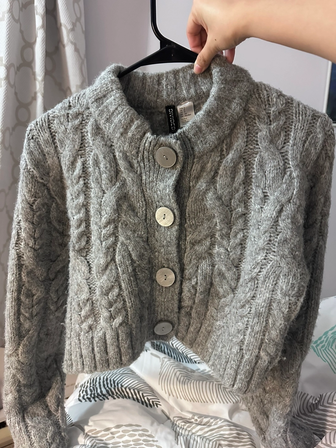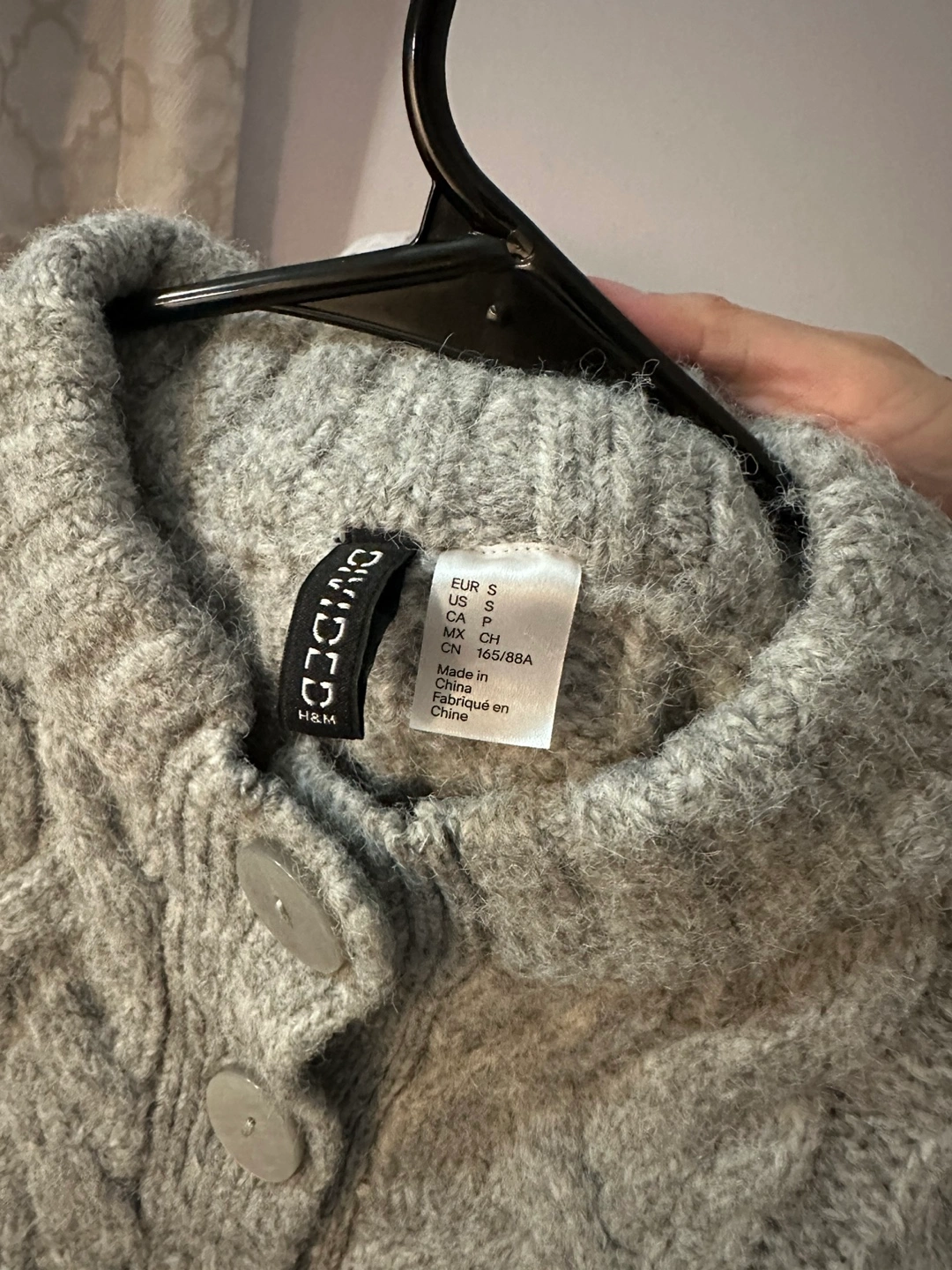 Grey cable knit cropped cardigan with button closure. Long sleeves. Size S.