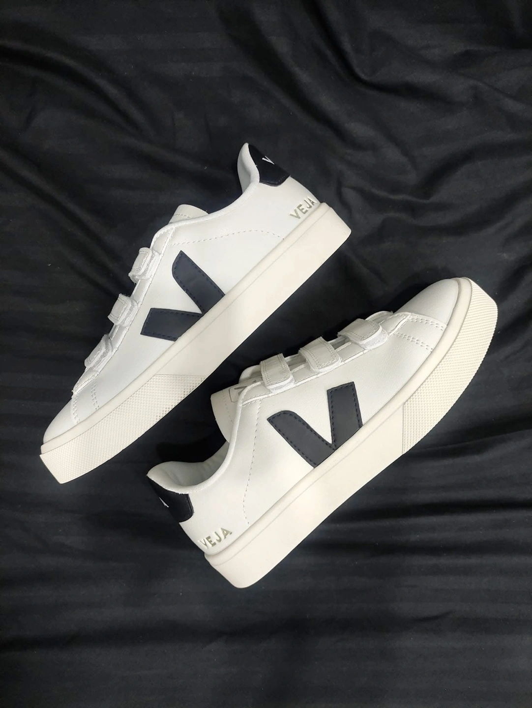 White leather sneakers with black accents, velcro straps, and a white rubber sole.