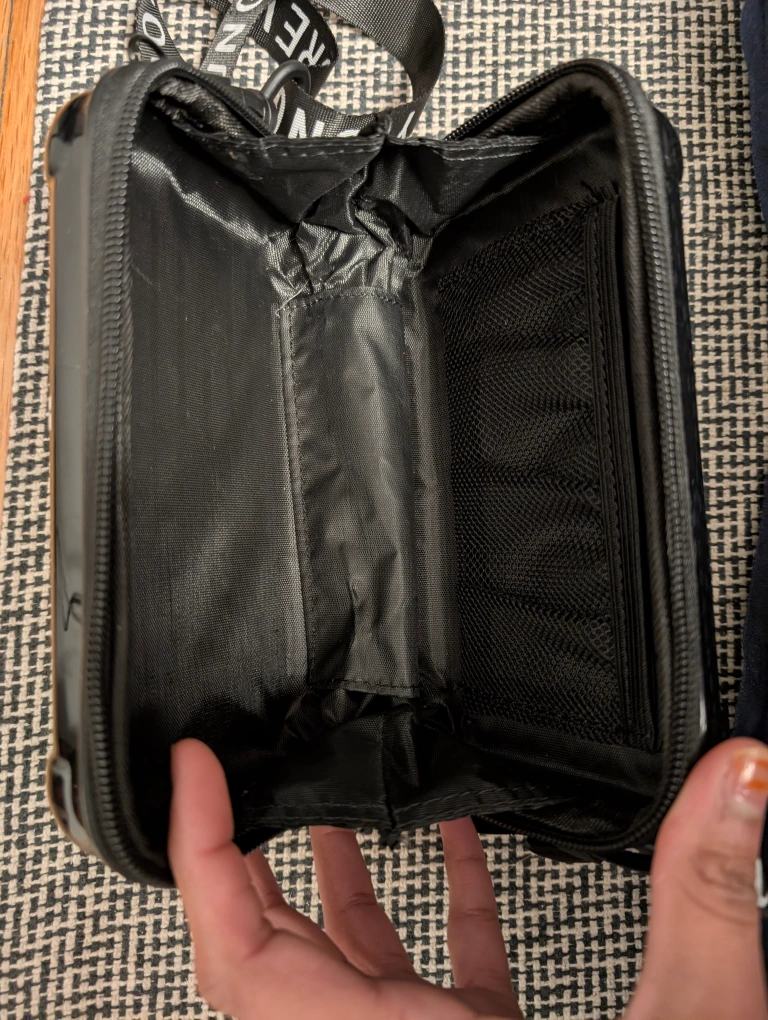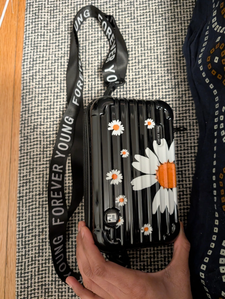 Black mini bag with white daisies, adjustable strap with Forever Young branding, zipper closure