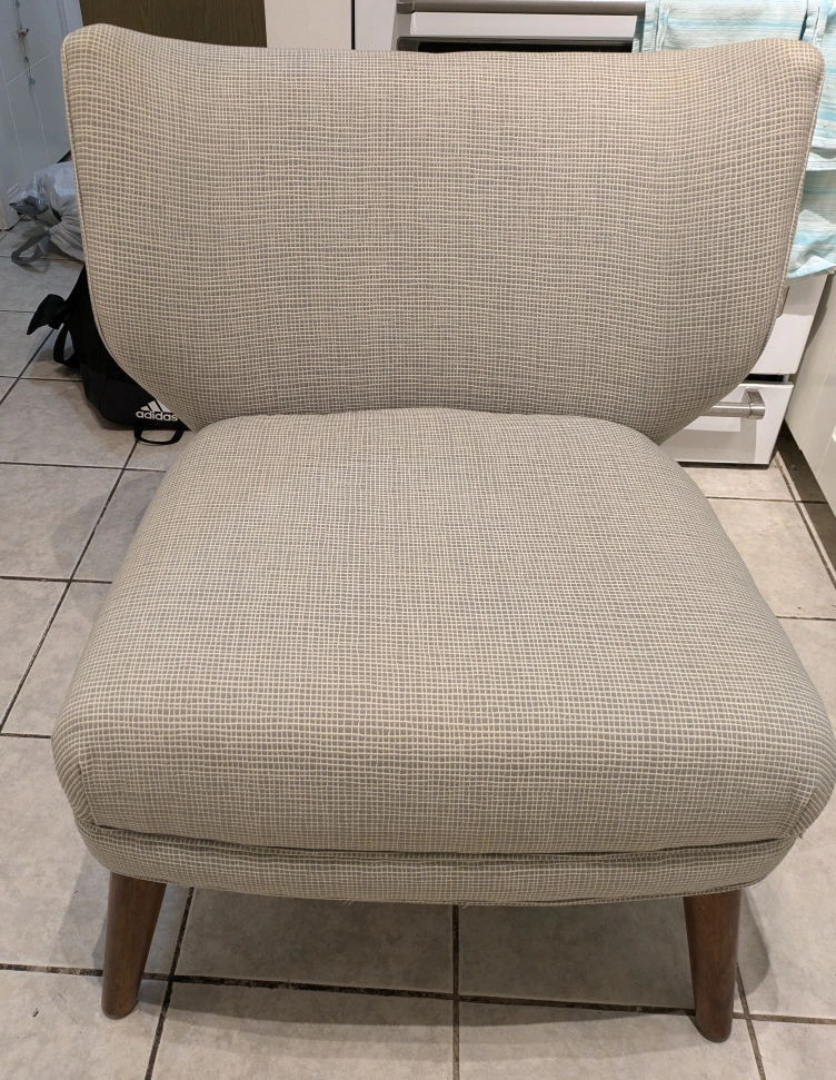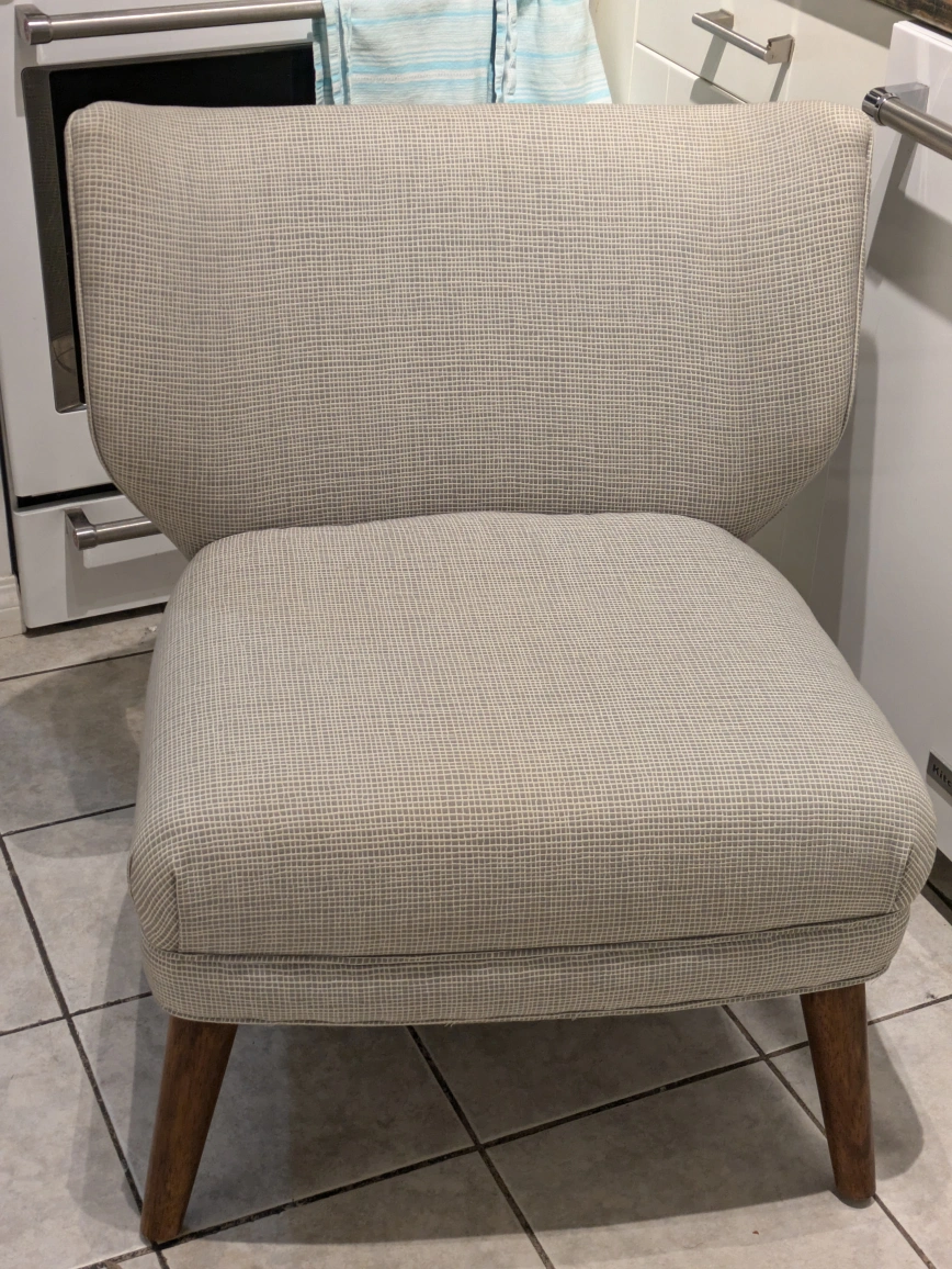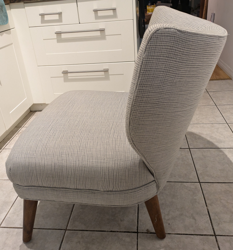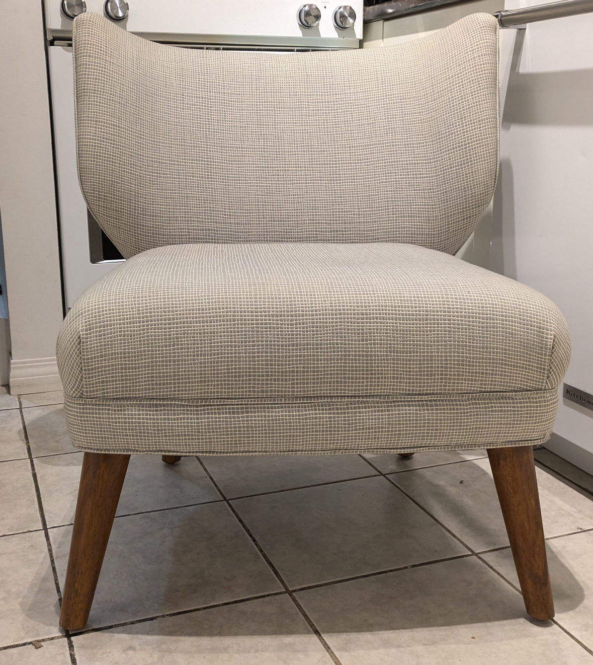 From West Elm a few years ago, a slipper chair in a greige color, with white cross hatching and wooden legs. The upholstery is a smooth woven fabric, similar to cotton but I don't know what the actual fabric content is.