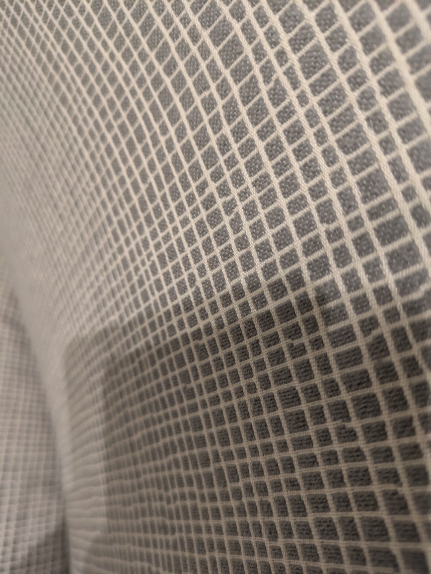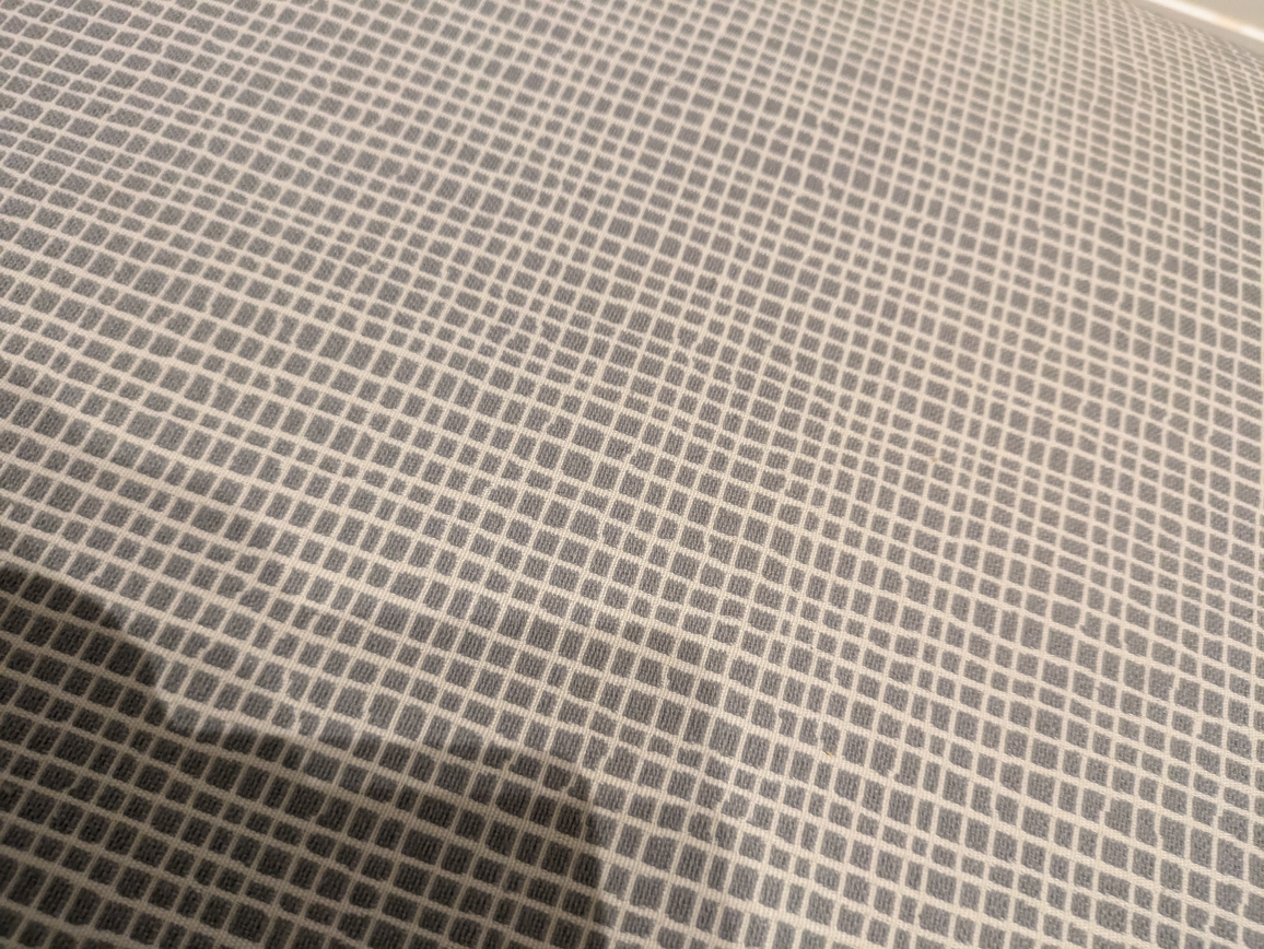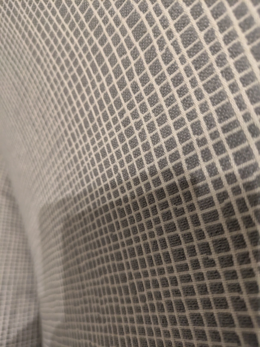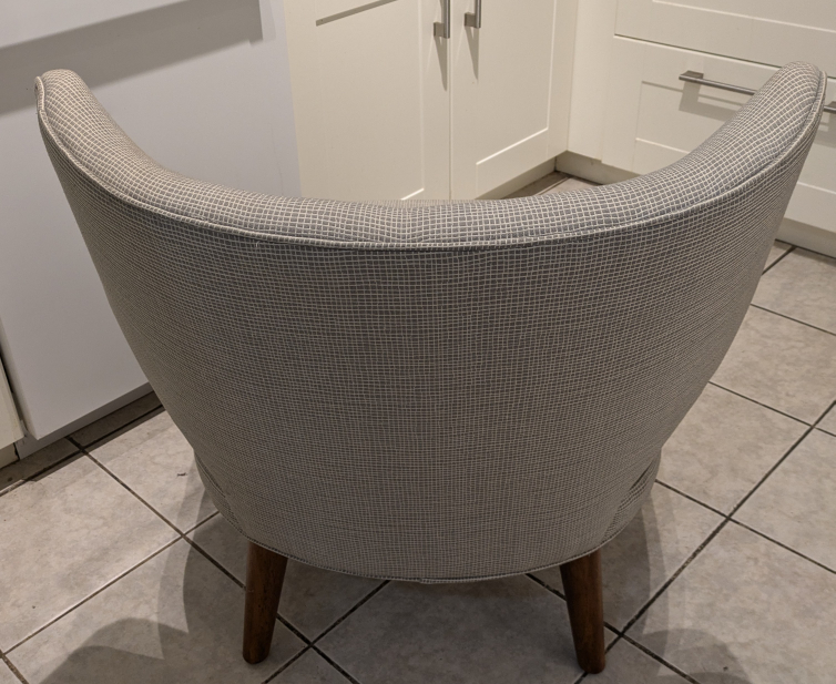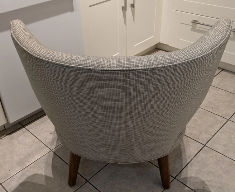 From West Elm a few years ago, a slipper chair in a greige color, with white cross hatching and wooden legs. The upholstery is a smooth woven fabric, similar to cotton but I don't know what the actual fabric content is.