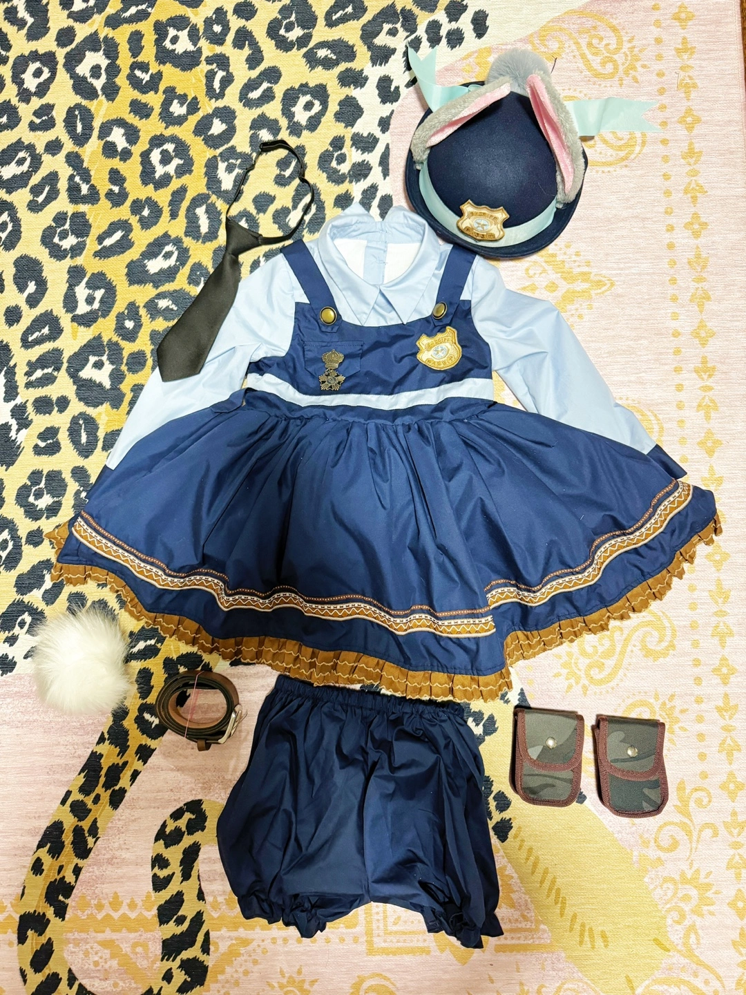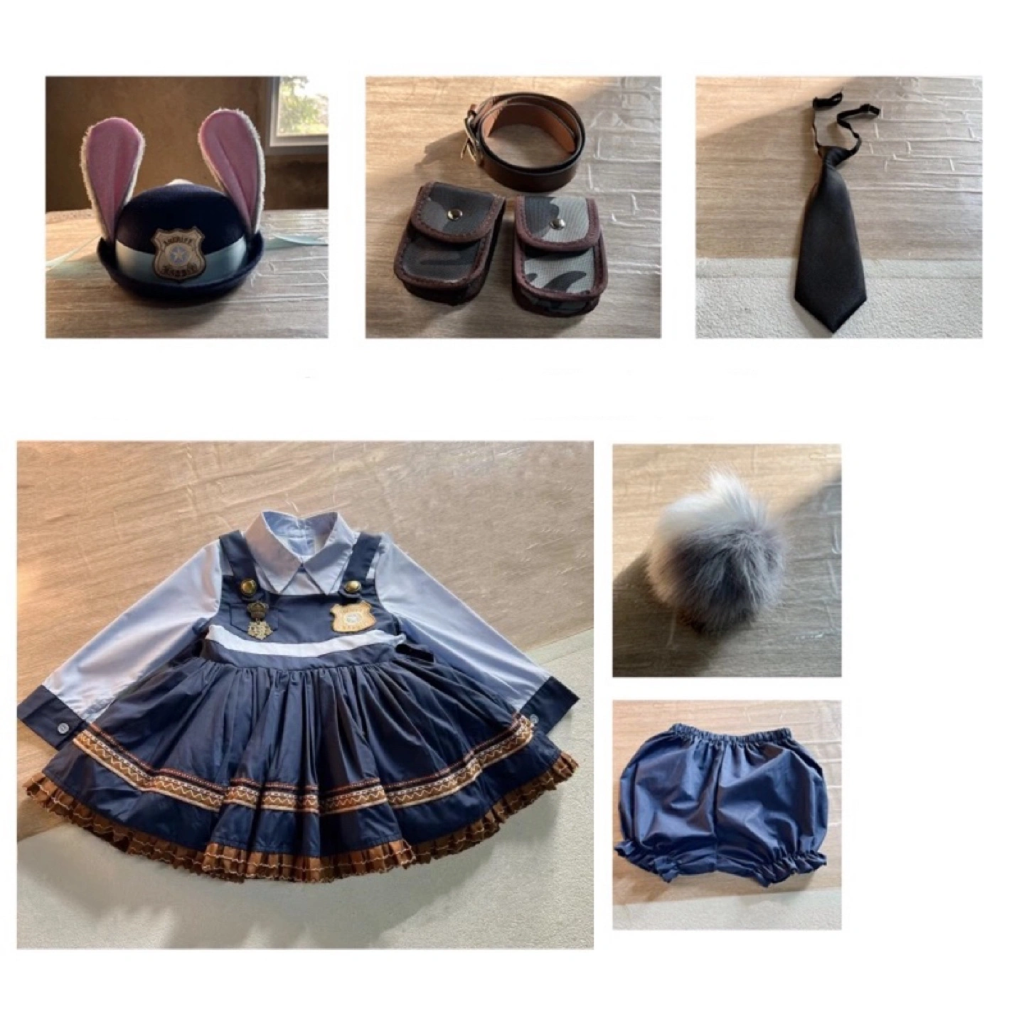 Complete Judy Hopps costume with dress, hat, tie, belt, pouches, tail, and bloomers. Washed already.