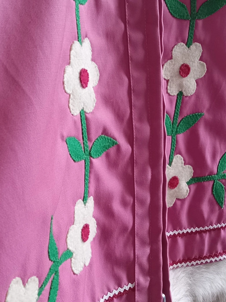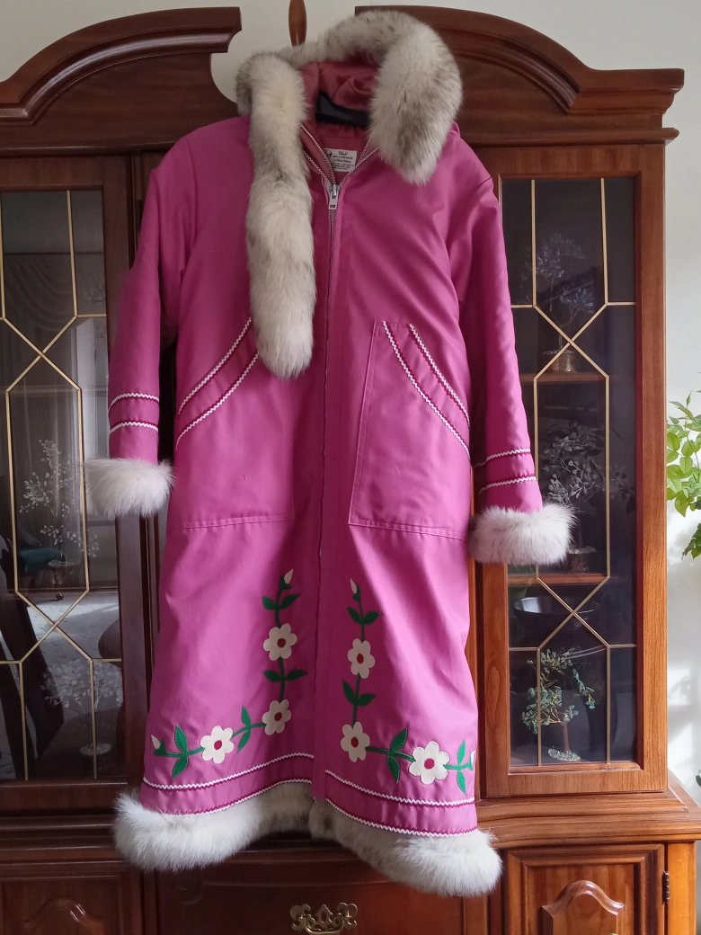 Yellowknife parka with outer shell, Pink with floral applique design. White fur trim around hood and cuffs. Zipper closure.