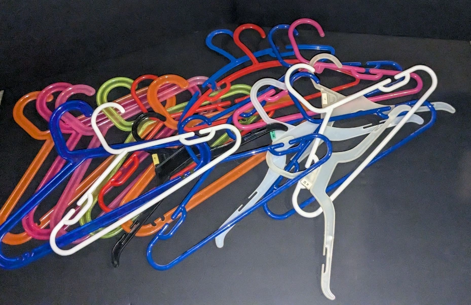 A large lot of 50 sturdy plastic clothing hangers. Some are coloured, some are white.