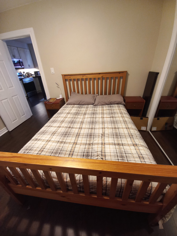 Wooden double bed frame. Includes headboard, footboard, and side rails. Some minor wear and tear. also includes mattress