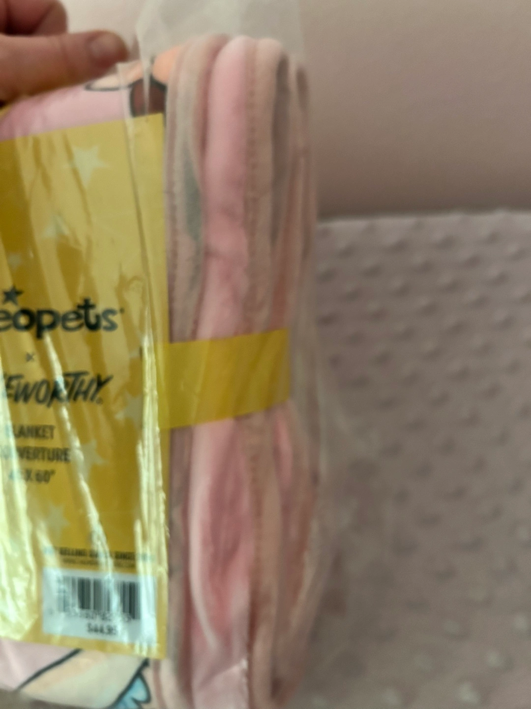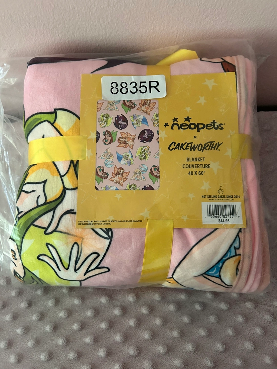 Pink Cakeworthy blanket with Neopets characters. 40 x 60 inches. New, never used. Discontinued. Some colour along the edge not sure if it supposed to be like that.