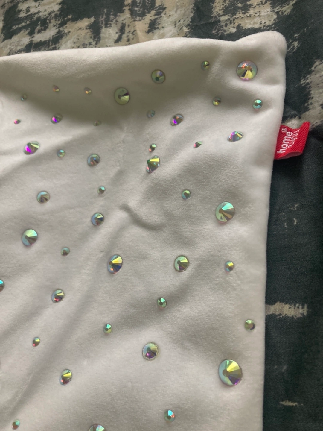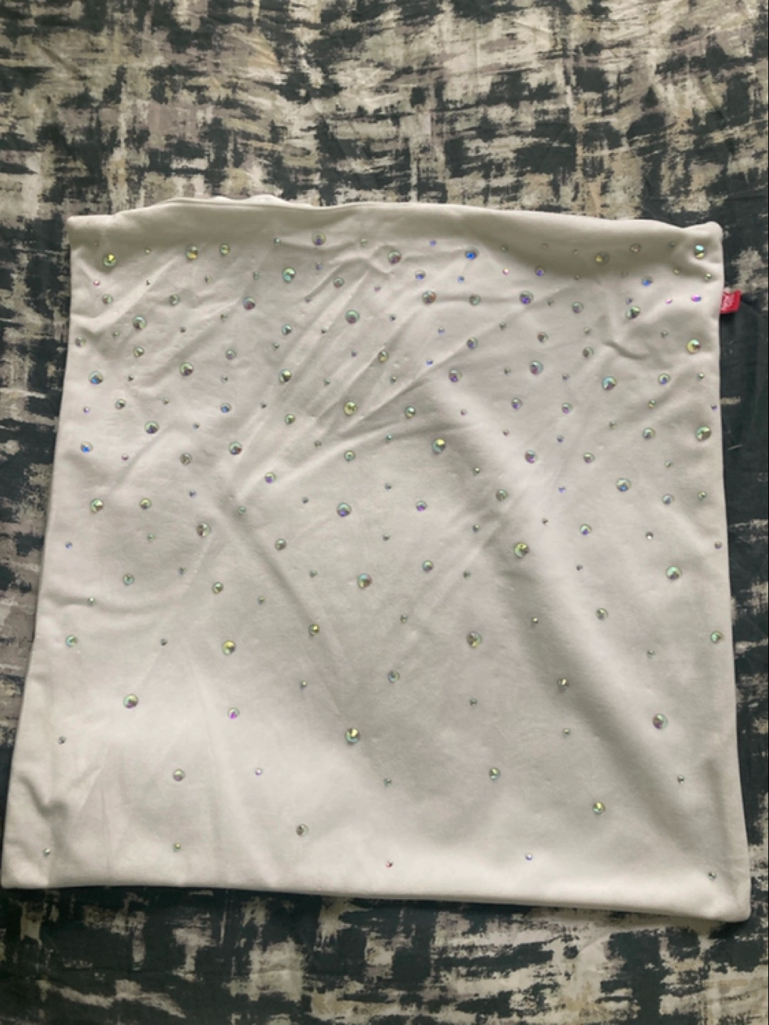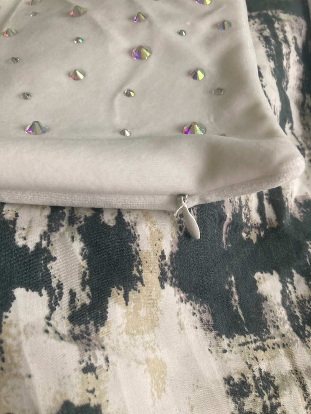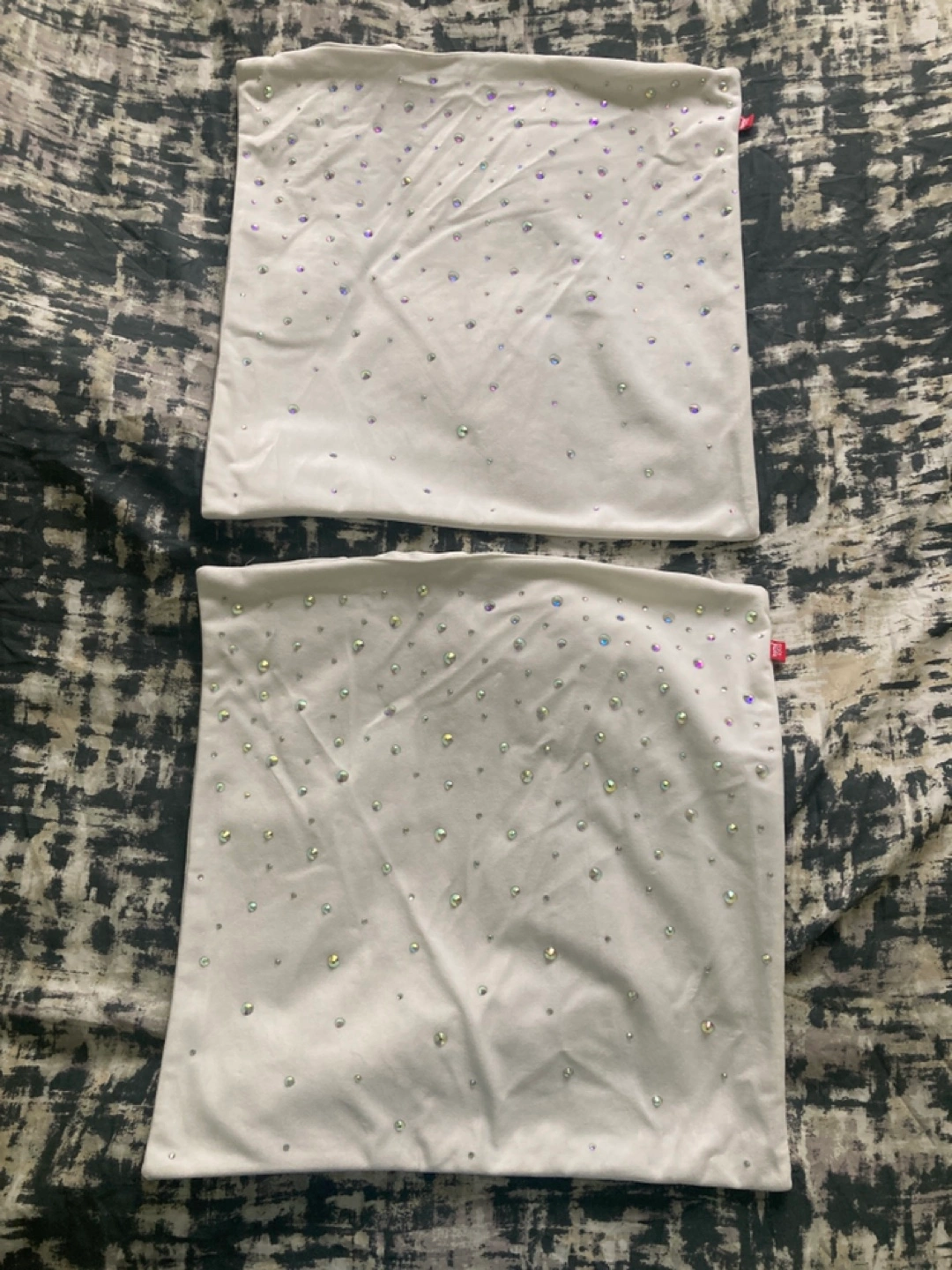 Set of 2 white velvet pillow covers with rhinestones. Zipper closure. Velvet material. Barely used. Only used as decorative pillows for a short time. Too many square pillowcases, decluttering. $2 for both 45 cm x 45 cm Pet free smoke free home Pickup Hurontario and Dundas in Mississauga. Cash only.