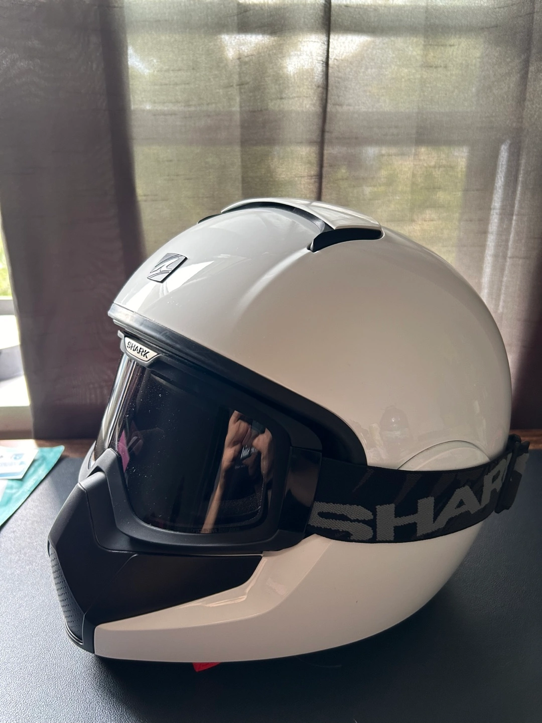 White motorcycle helmet with a built-in visor and tinted goggles.
