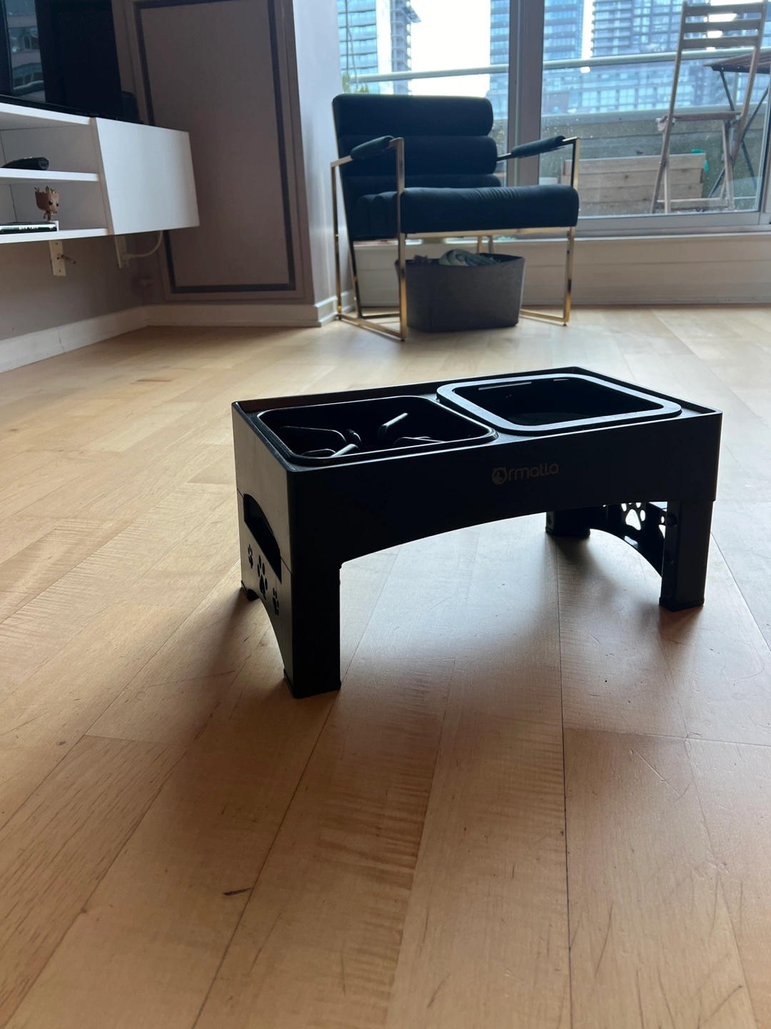 Elevated dog food bowl with two bowls and adjustable height. Floor stays dry because the water portion is anti-splash. Gently used, this dish saved my hardwood floor.