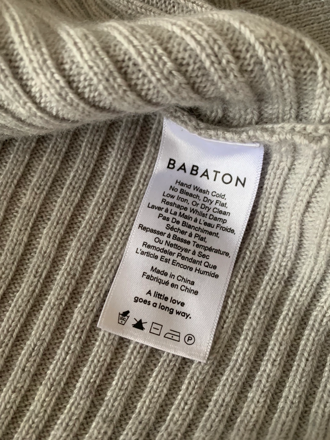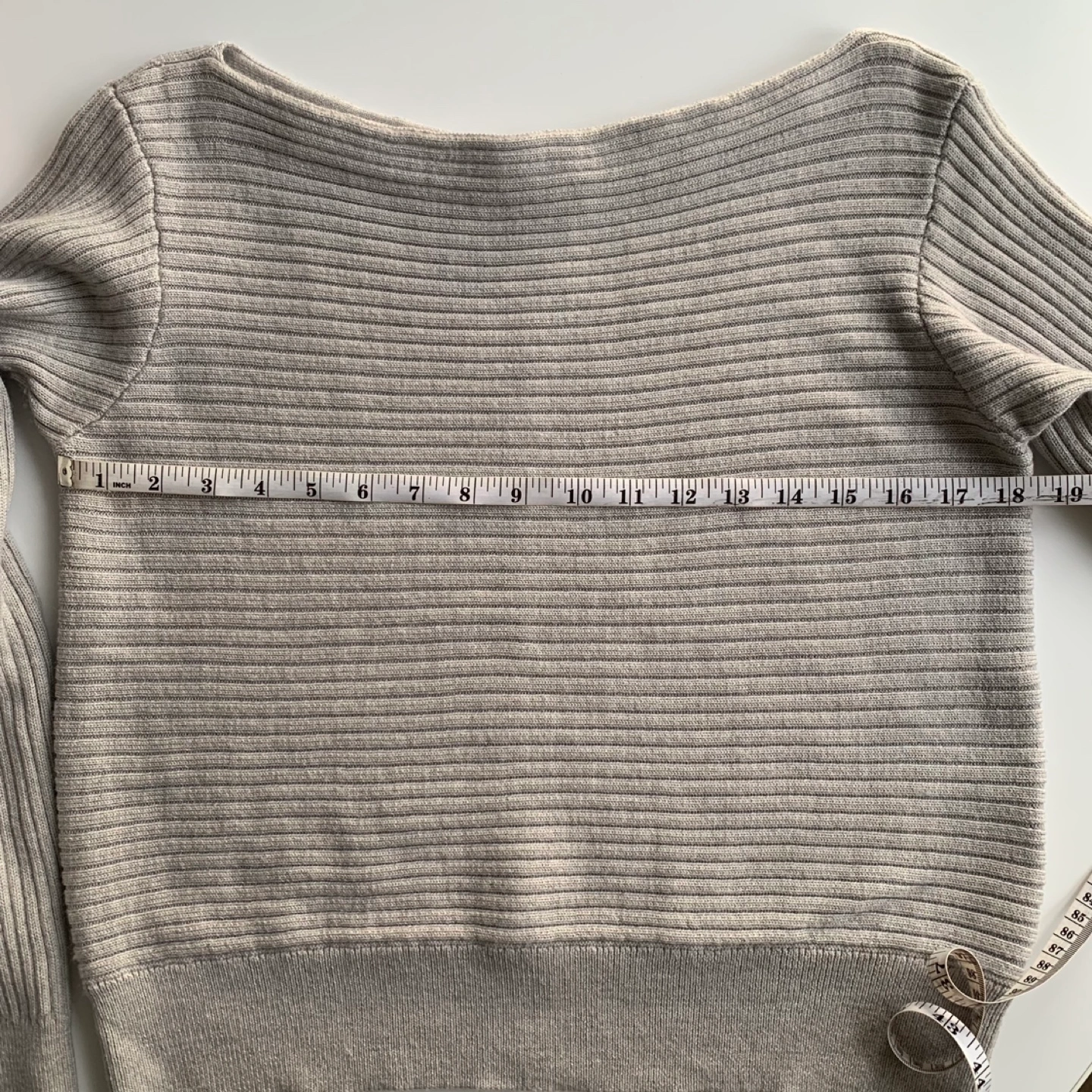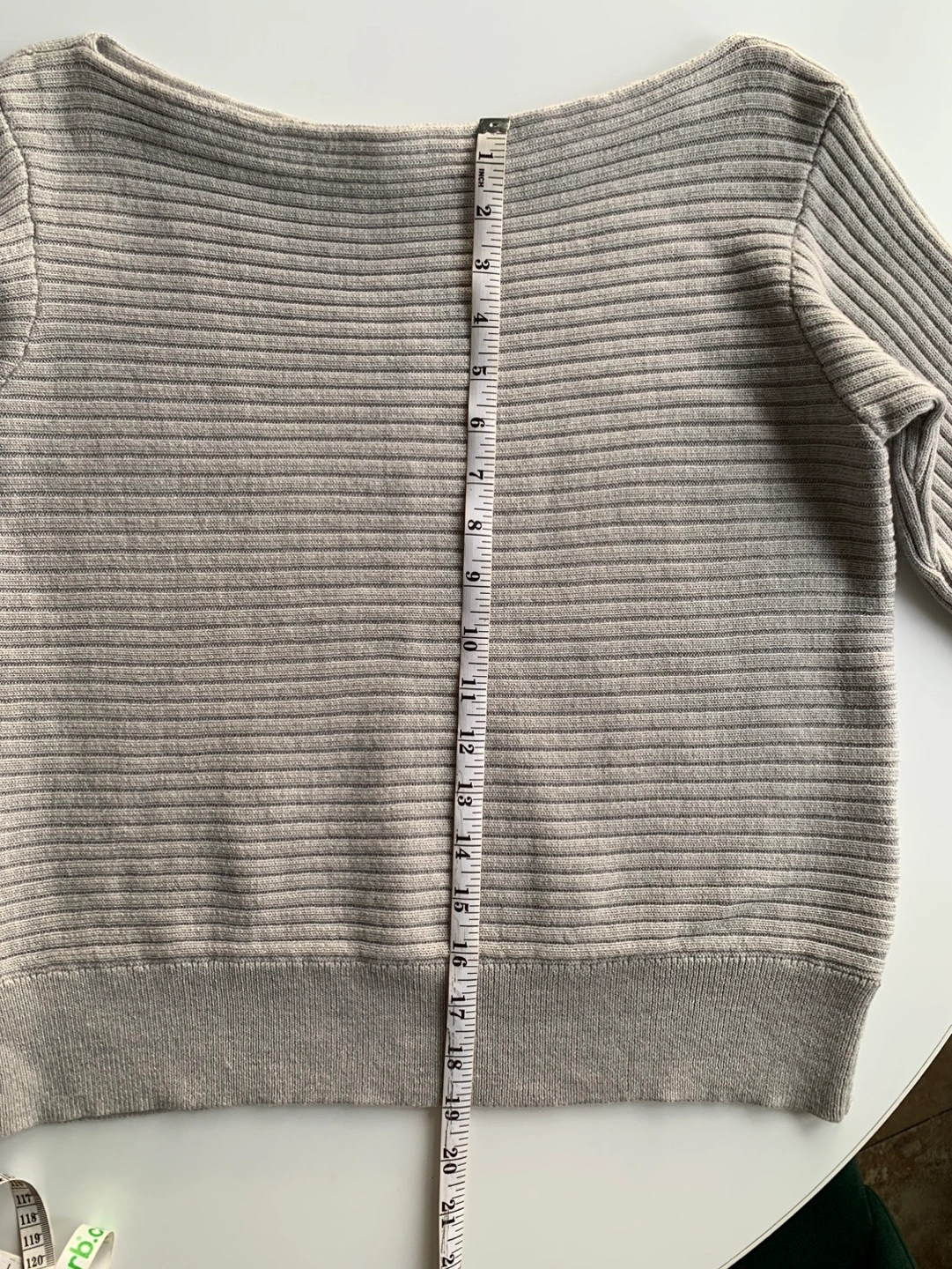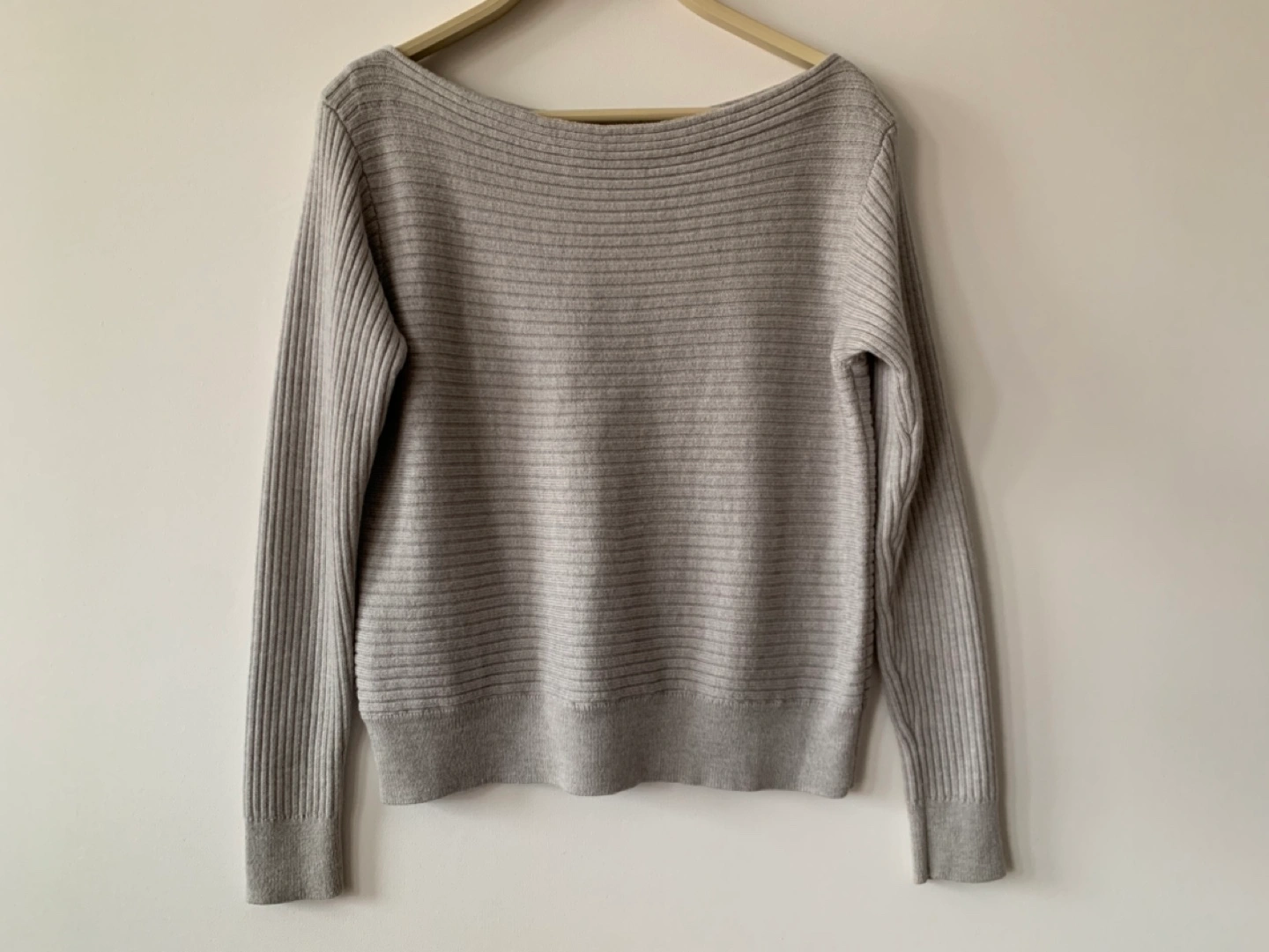 Grey ribbed sweater, long sleeves, size small. 100% Merino wool. It’s a really nice soft sweater, but no longer my style.