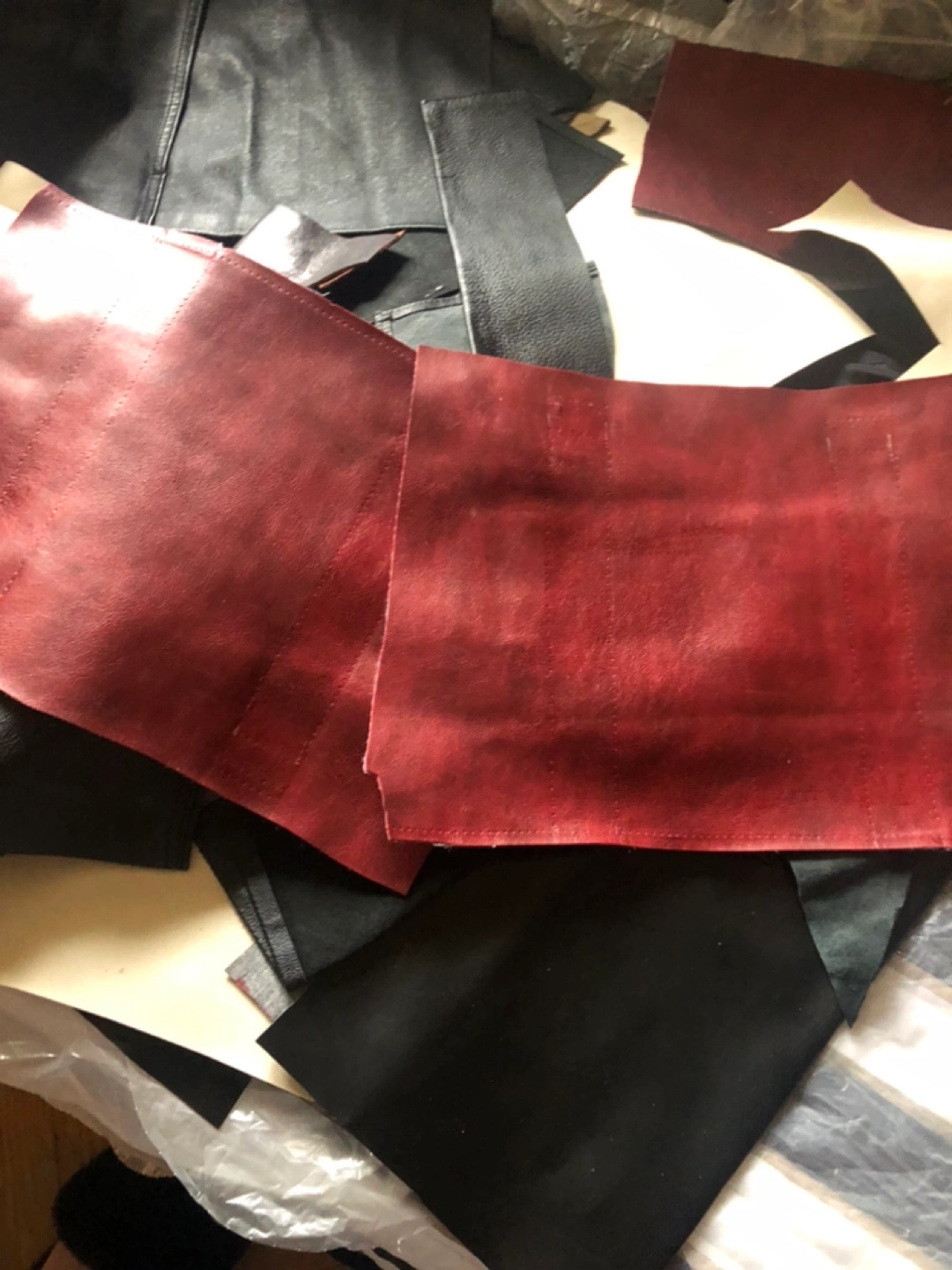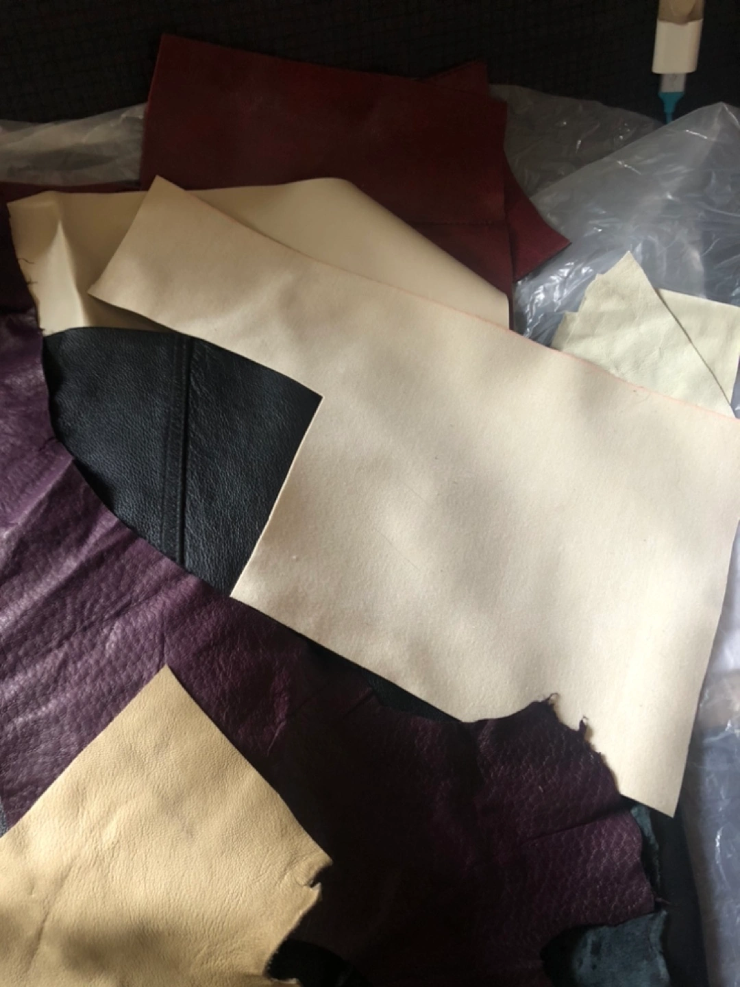 Assortment of leather and pleather remnants in various colours and sizes.
