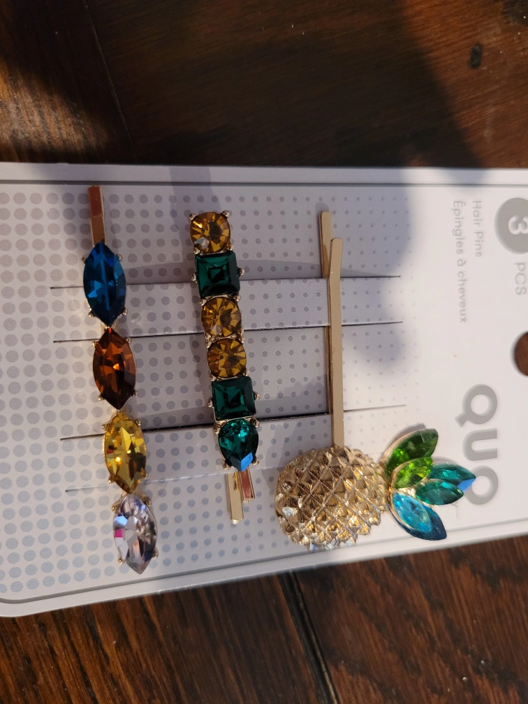 Set of 3 hair pins with gold metal and jewel accents. The set comes with 3 different coloured pins, each with a different jewel design. The package has a small gold pineapple charm.