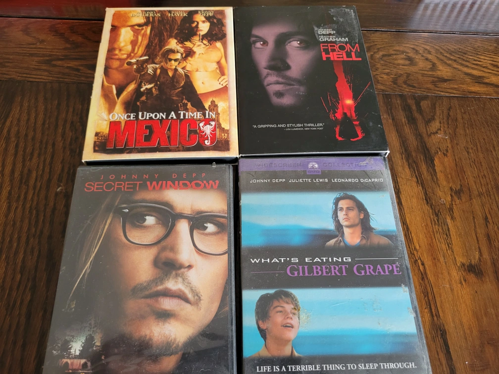 Four DVDs featuring Johnny Depp in lead roles. Titles included are Secret Window, Once Upon a Time in Mexico, From Hell, and What's Eating Gilbert Grape.
