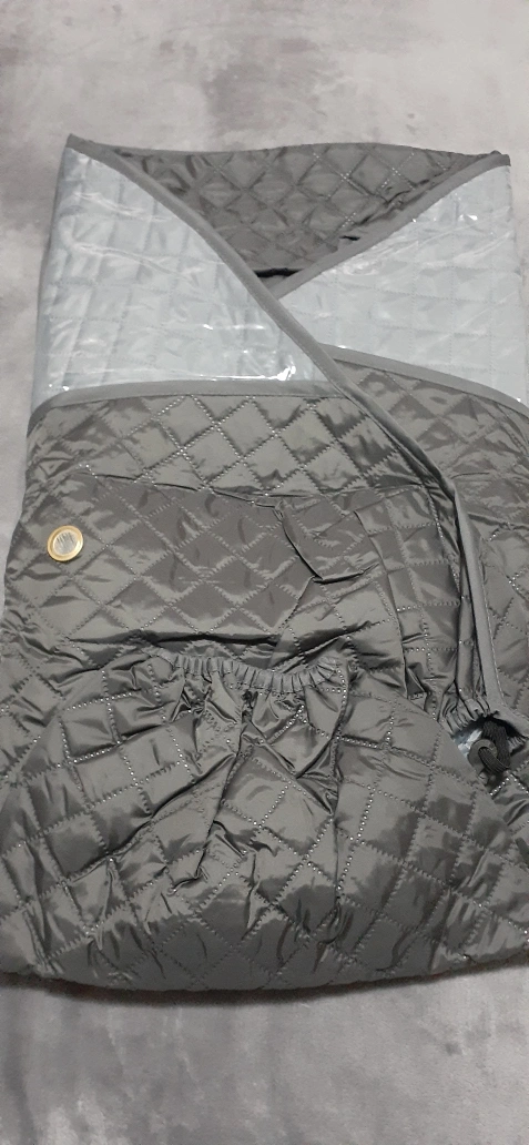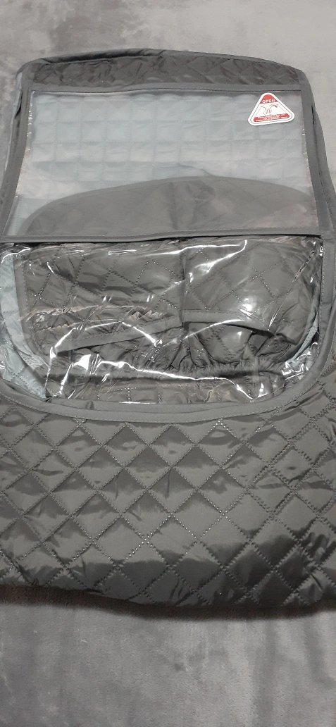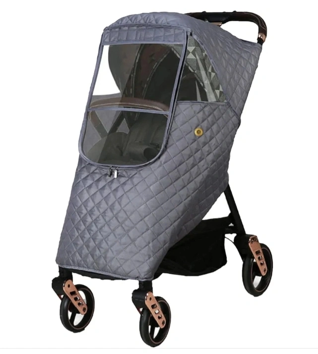 Stroller rain cover with a clear window. Grey quilted fabric.