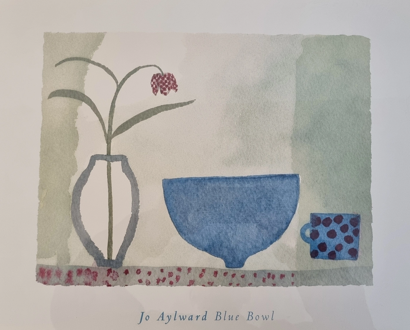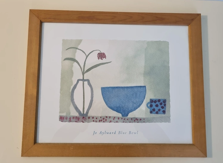 43Framed print of a watercolour painting by Jo Aylward. Features a blue bowl, vase and a cup.