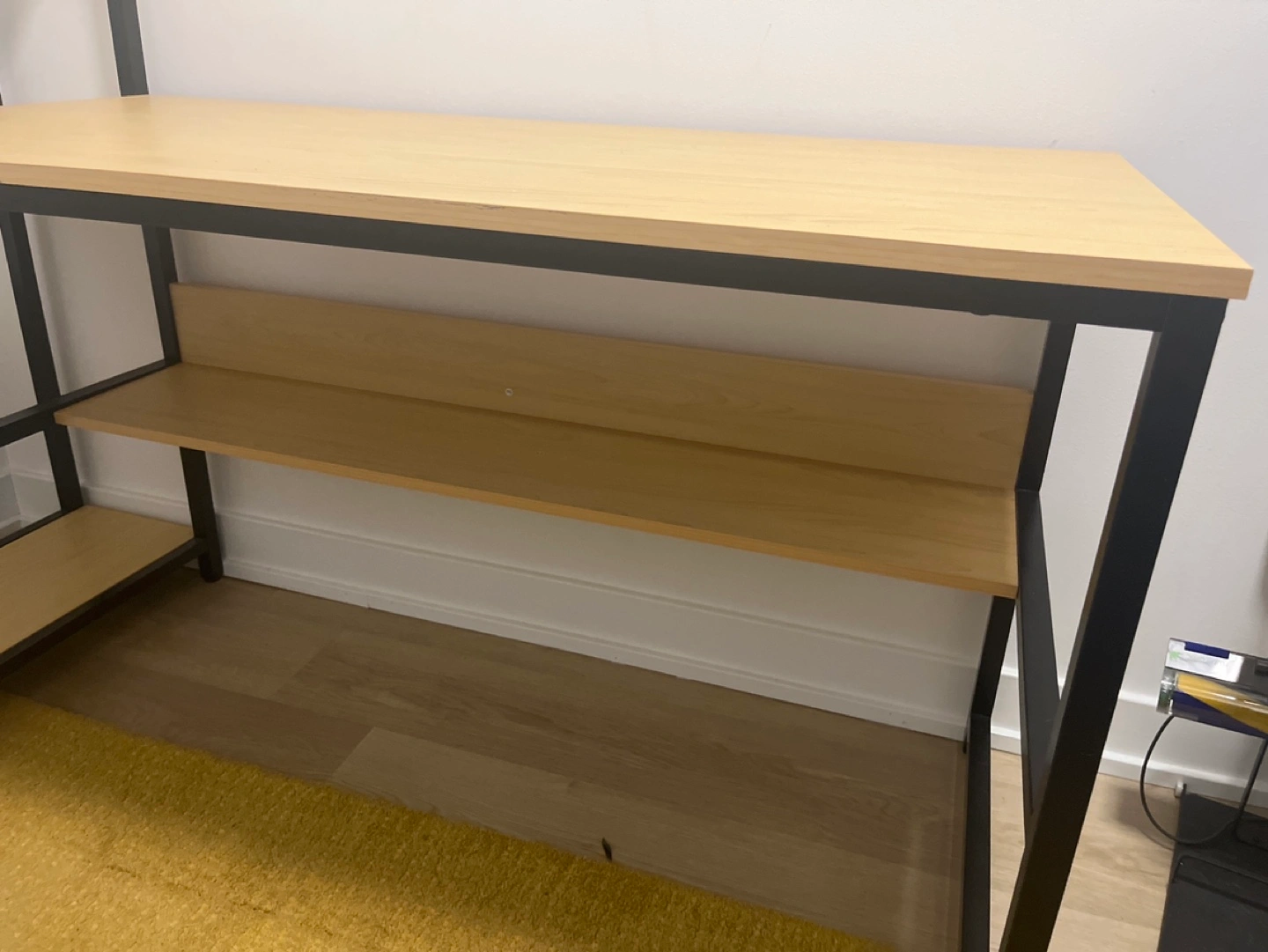 This, modern desk features a minimalist design with a natural wood surface and sturdy black metal frame. Perfect for home offices or study spaces, its clean lines and neutral tones complement various decor styles. Ideal for maximizing space while maintaining a contemporary look.